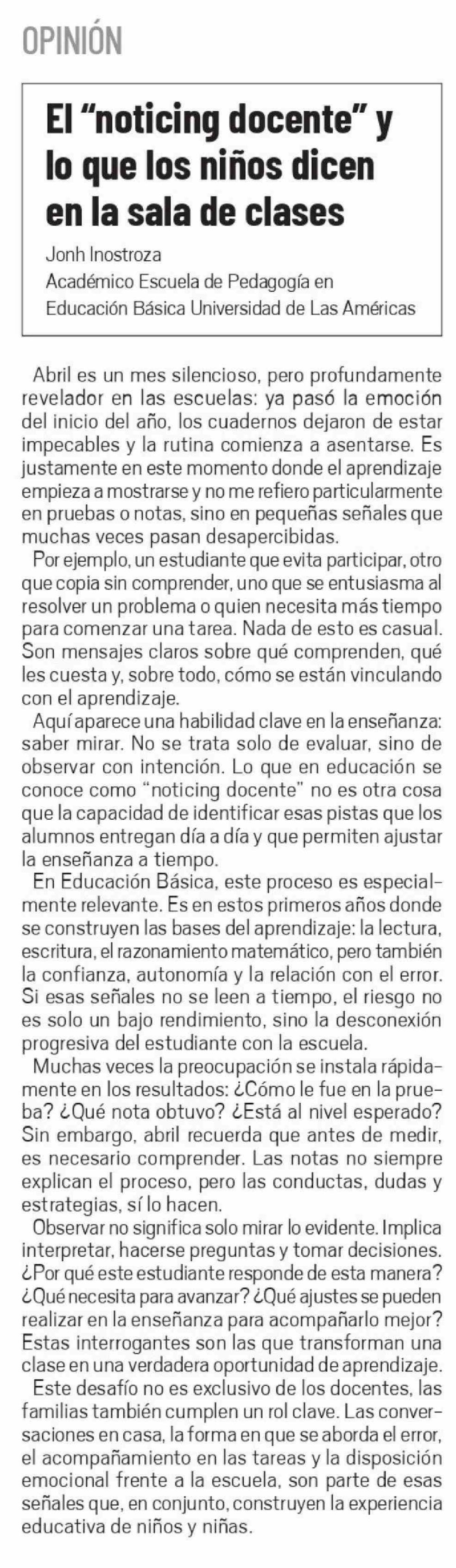 Columnas de Opinión: El "noticing docente" y lo que los niños dicen en la sala de clases
