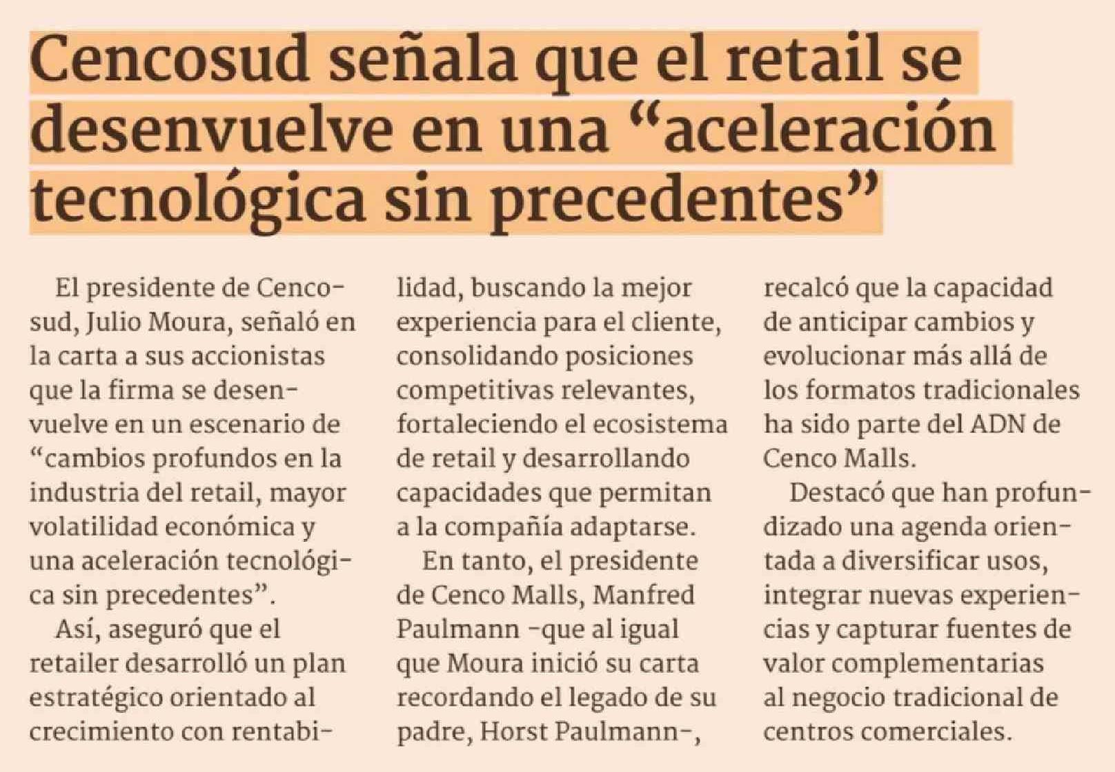 Cencosud señala que el retail se desenvuelve en una "aceleración tecnológica sin precedentes"