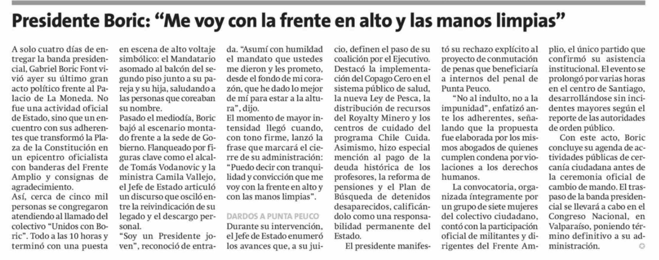 Título: Presidente Boric: "Me voy con la frente en alto y las manos limpias"