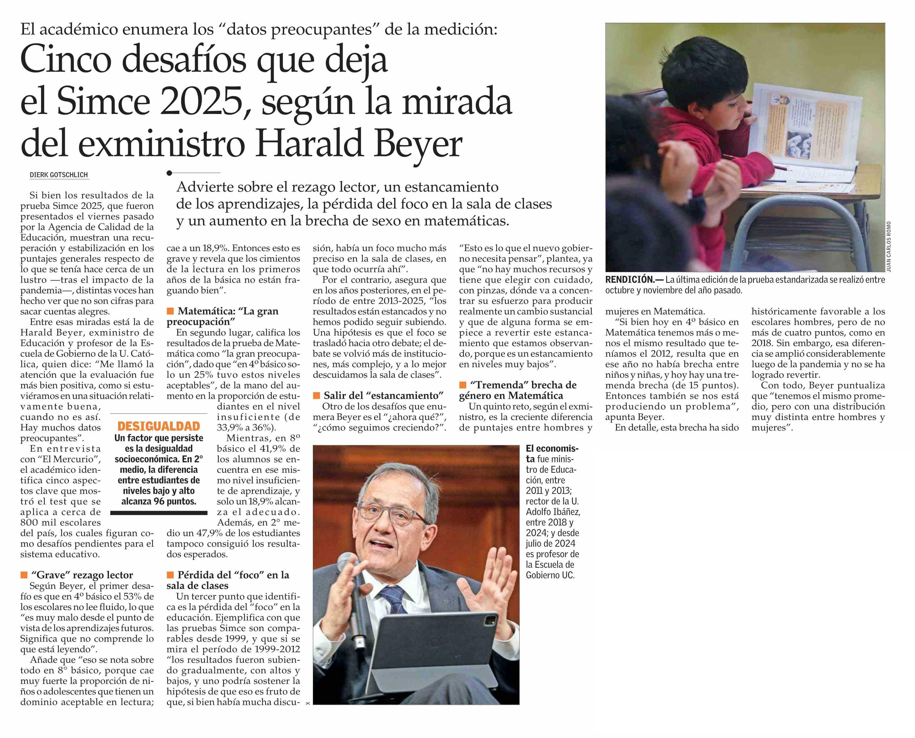 Cinco desafíos que deja el Simce 2025, según la mirada del exministro Harald Beyer