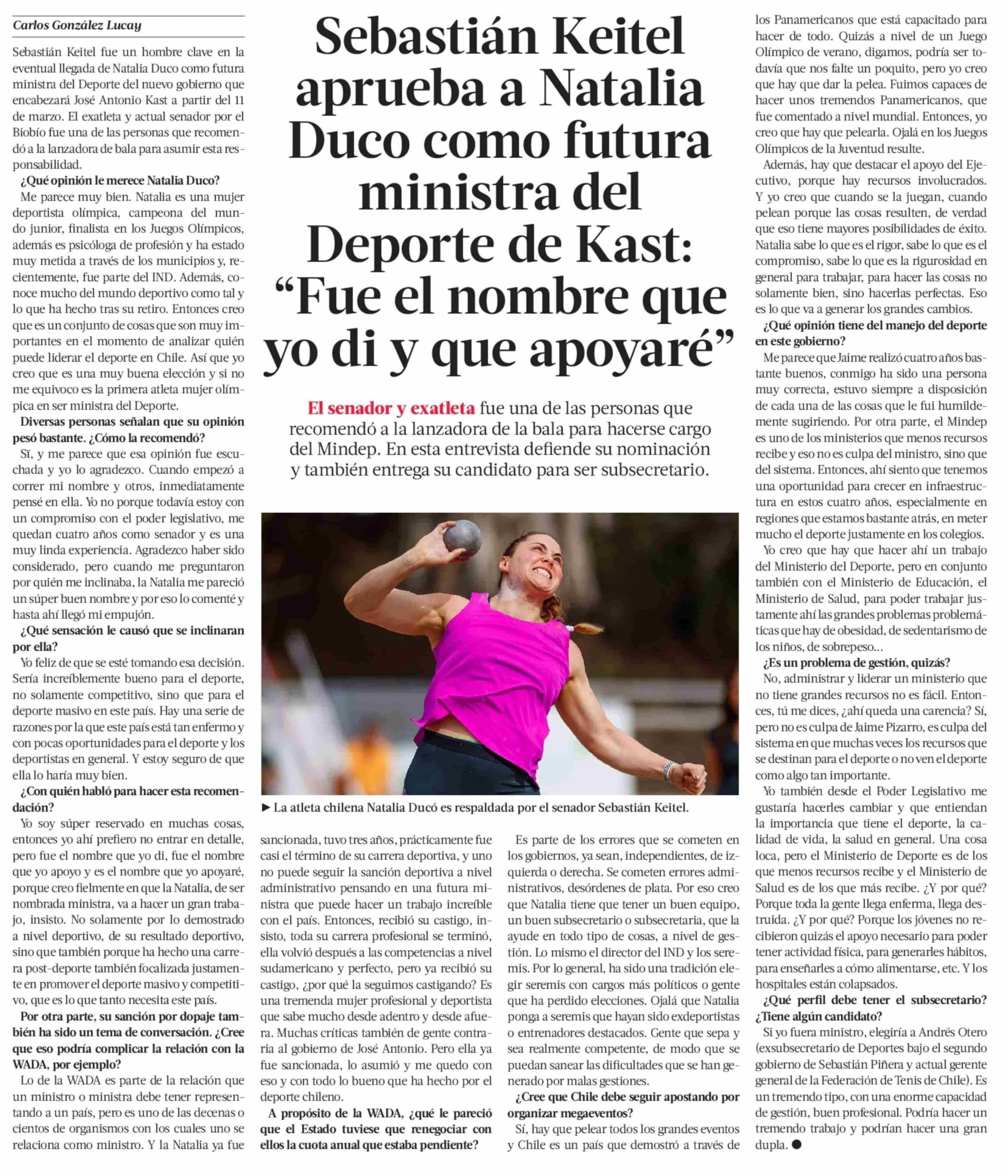 Sebastián Keitel aprueba a Natalia Duco como futura ministra del Deporte de Kast: "Fue el nombre que yo di y que apoyaré"