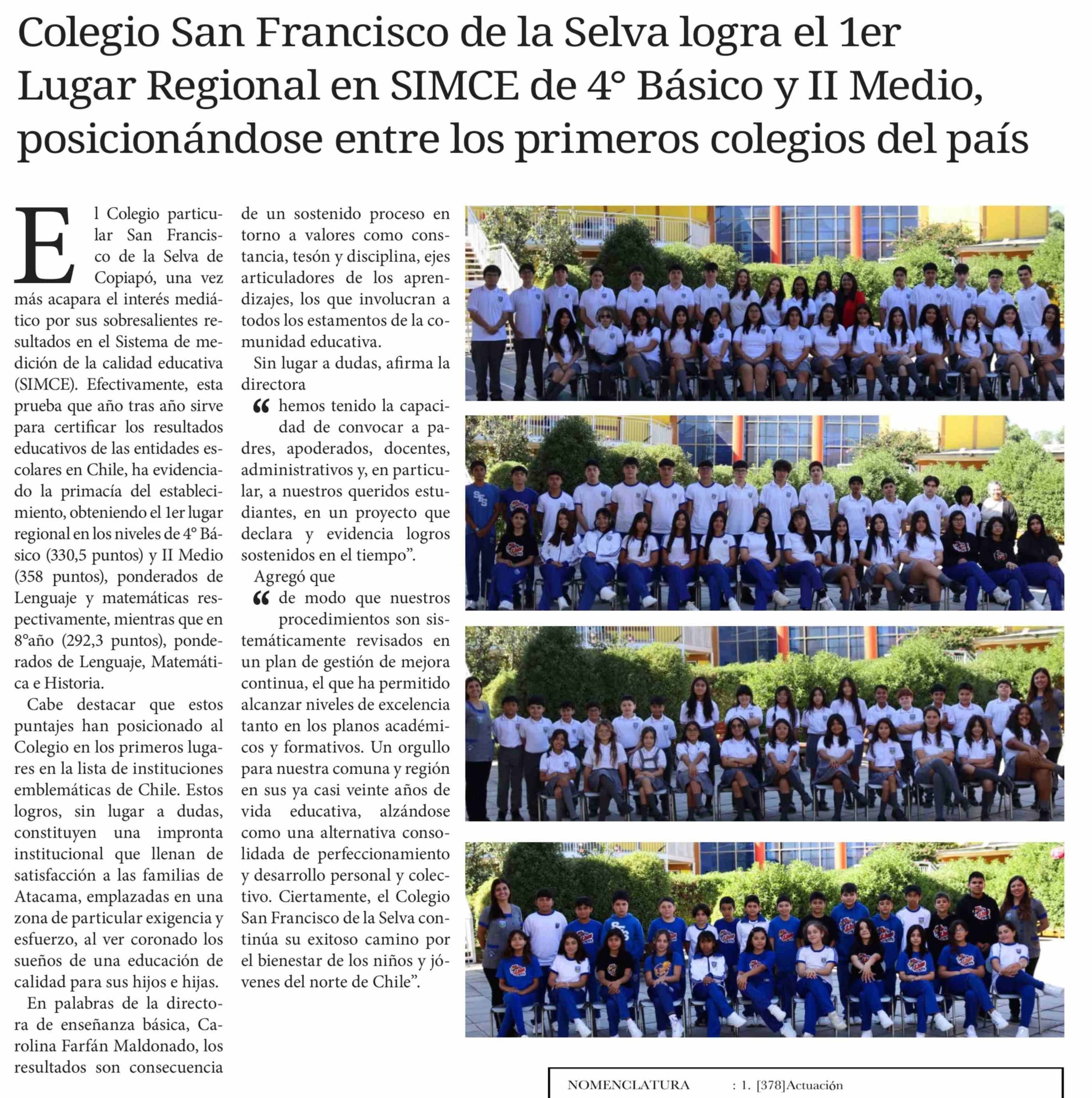 | Título: | Colegio San Francisco de la Selva logra el 1er Lugar Regional en SIMCE de 4° Básico y II Medio, posicionándose entre los primeros colegios del país |