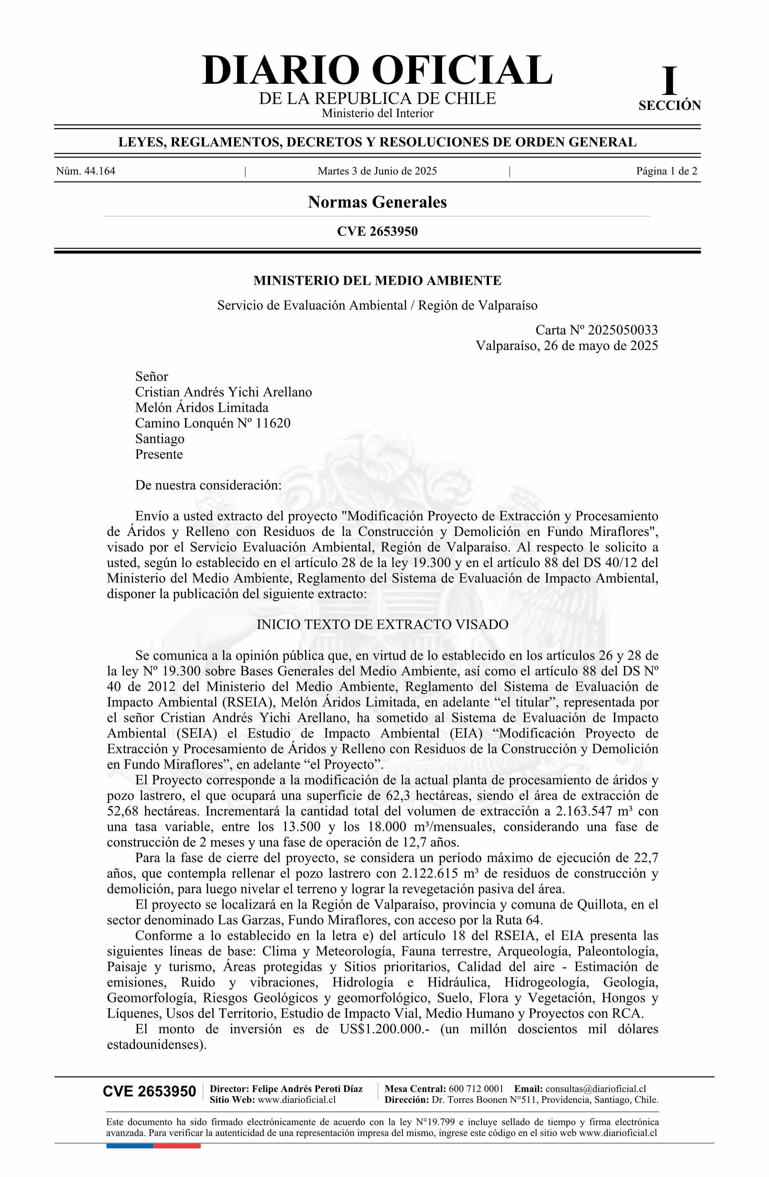 | Título: | Extracto de Estudio de Impacto Ambiental Modifica Proyecto de Extracción y Procesamiento de Áridos y Relleno con Residuos de la Construcción y Demolición en Fundo Miraflores |