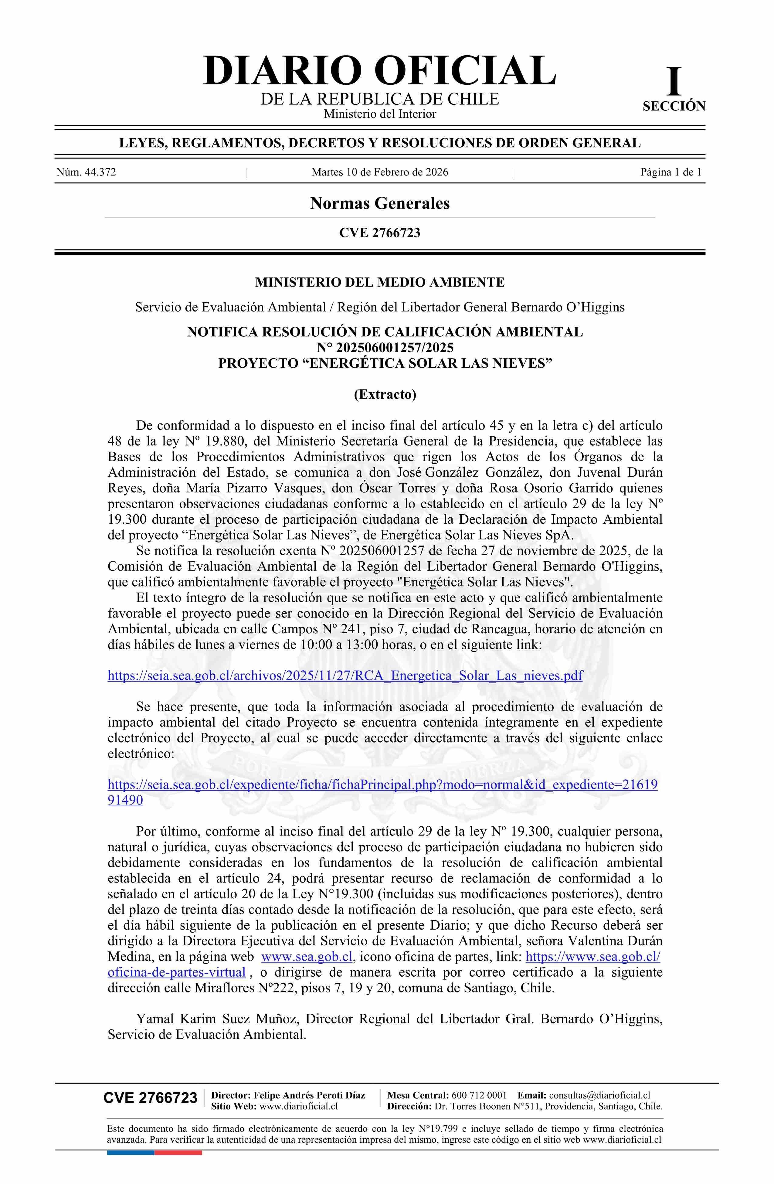 | Título: | Extracto de resolución exenta número 202506001257, de 2025.- Califica Ambientalmente Favorable el Proyecto Energética Solar Las Nieves |