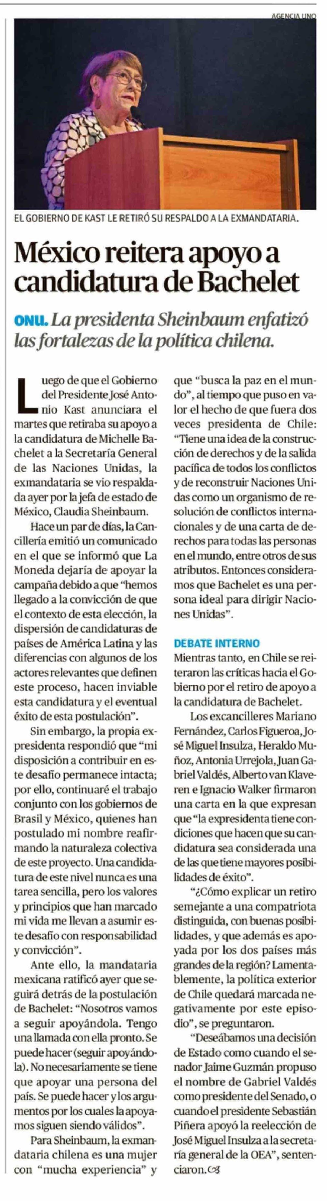 México reitera apoyo a candidatura de Bachelet