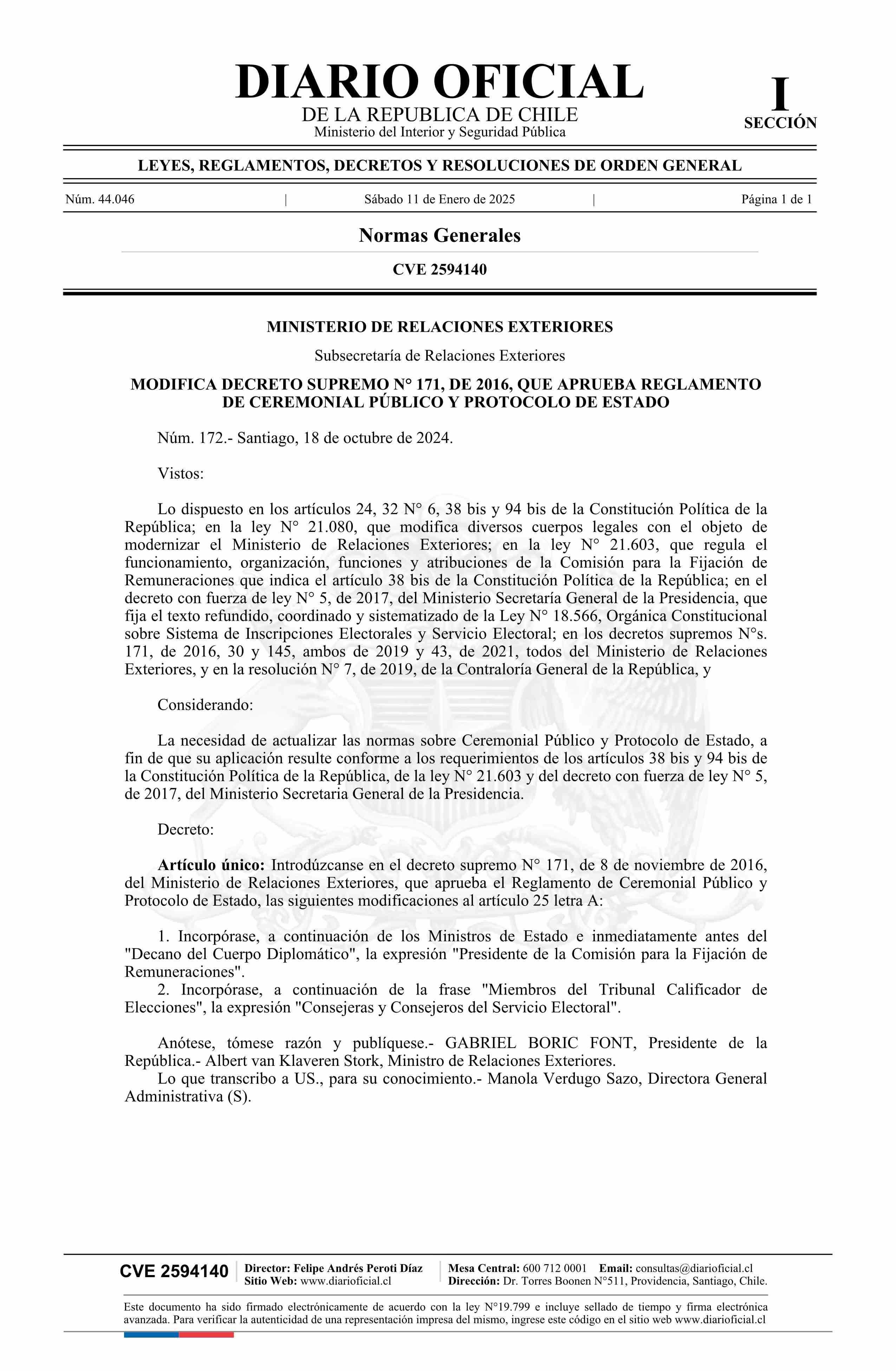 | Título: | Decreto número 172, de 2024.- Modifica decreto N° 171, de 2016, que aprueba Reglamento de Ceremonial Público y Protocolo del Estado |