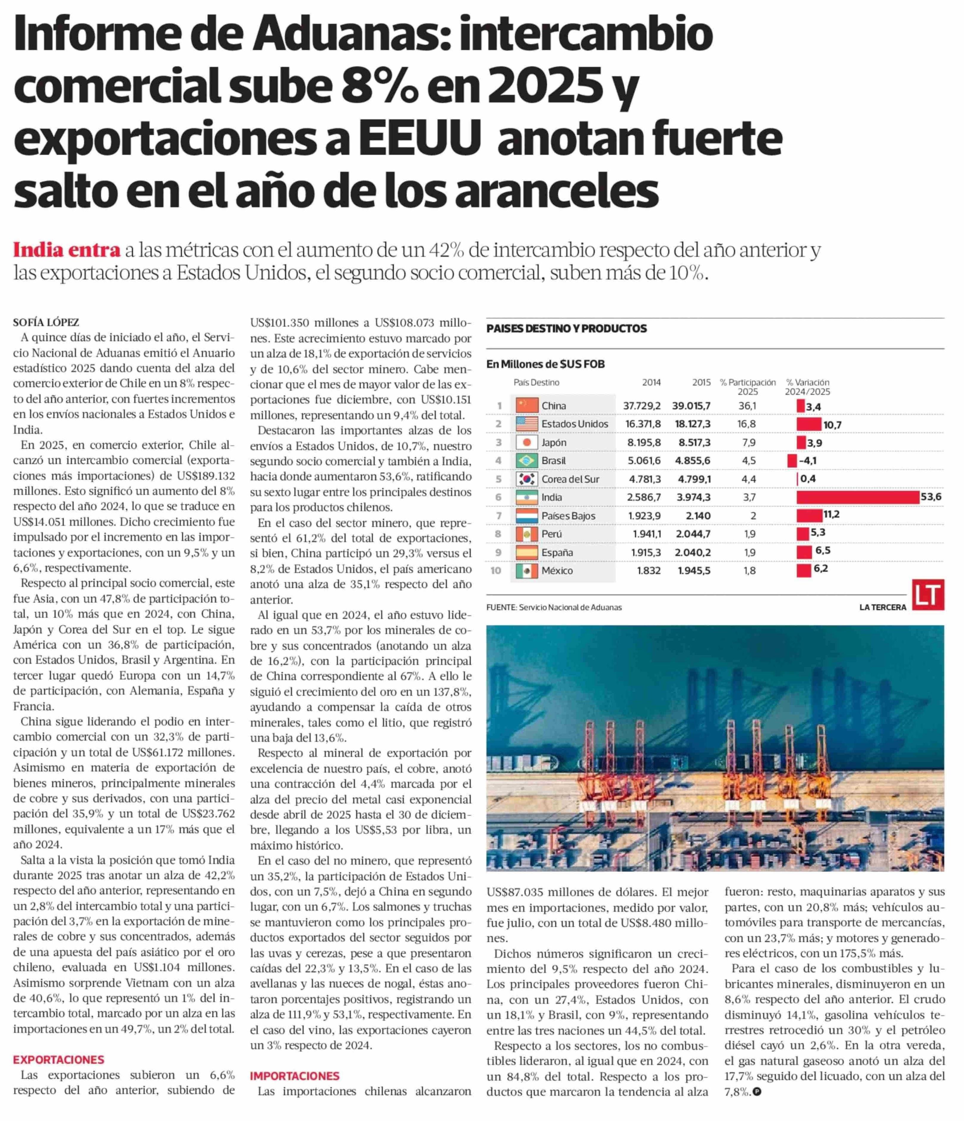 Informe de Aduanas: intercambio comercial sube 8% en 2025 y exportaciones a EEUU anotan fuerte salto en el año de los aranceles