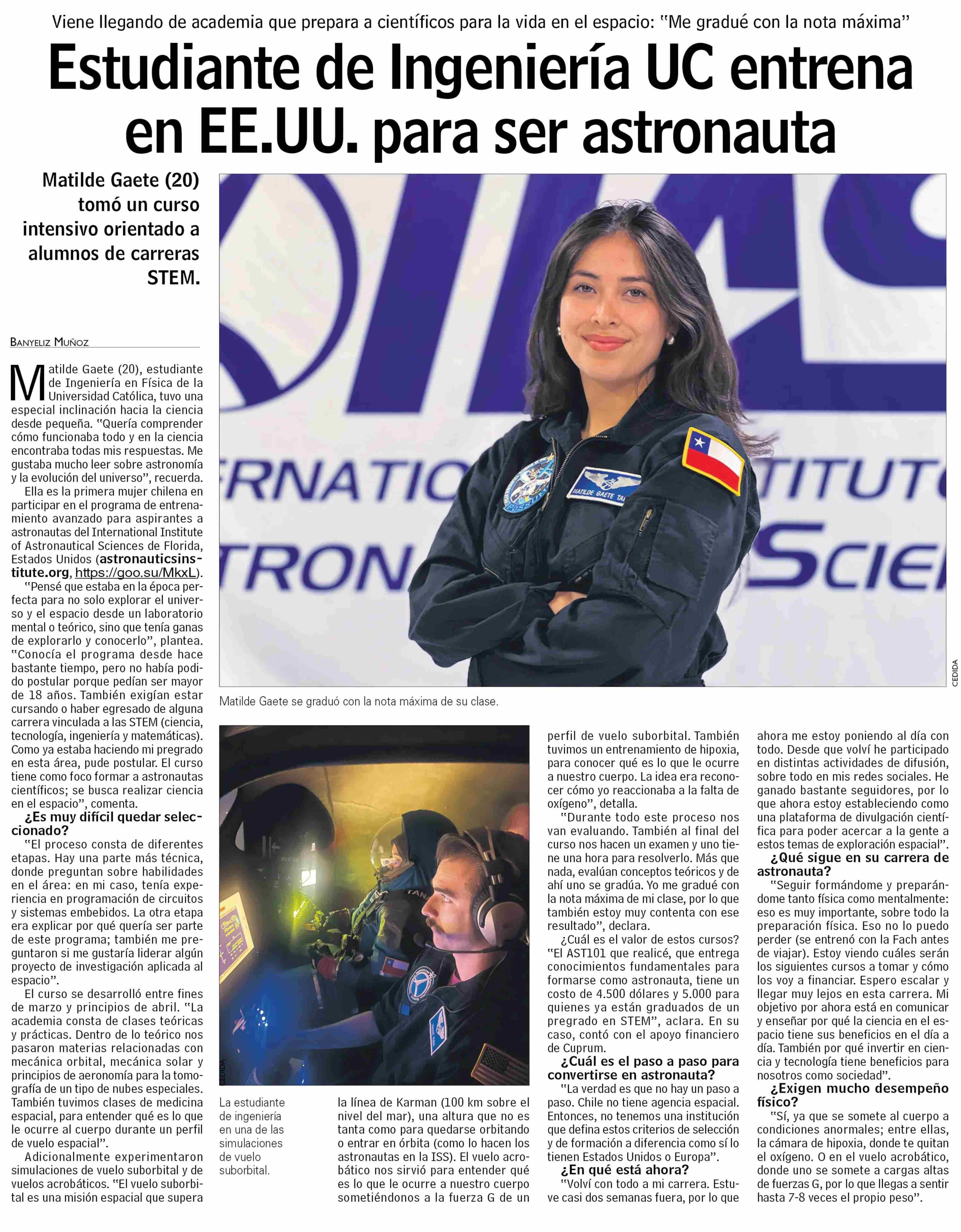 Estudiante de Ingeniería UC entrena en EE.UU. para ser astronauta