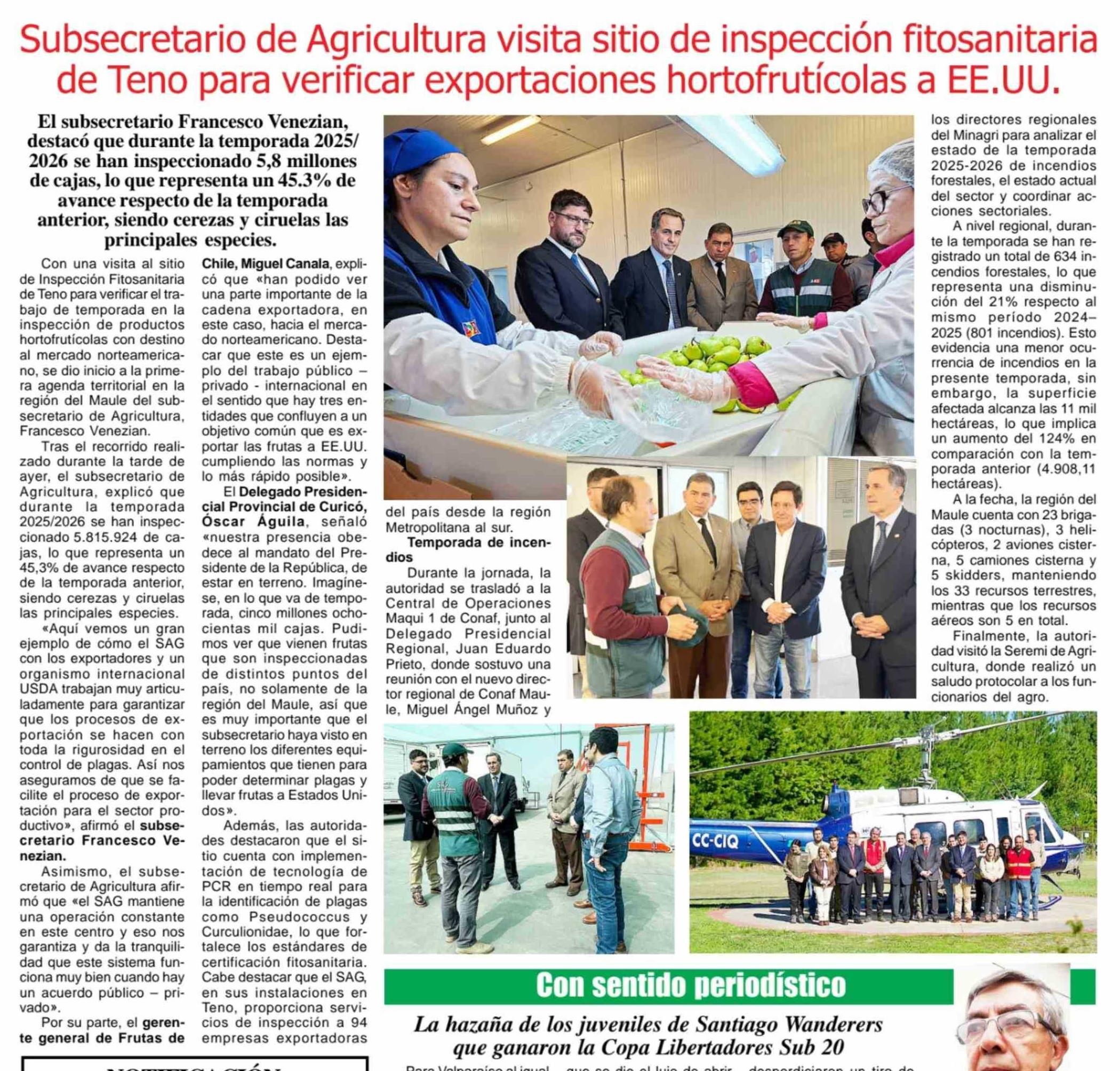 Subsecretario de Agricultura visita sitio de inspección fitosanitaria de Teno para verificar exportaciones hortofrutícolas a EE.UU.