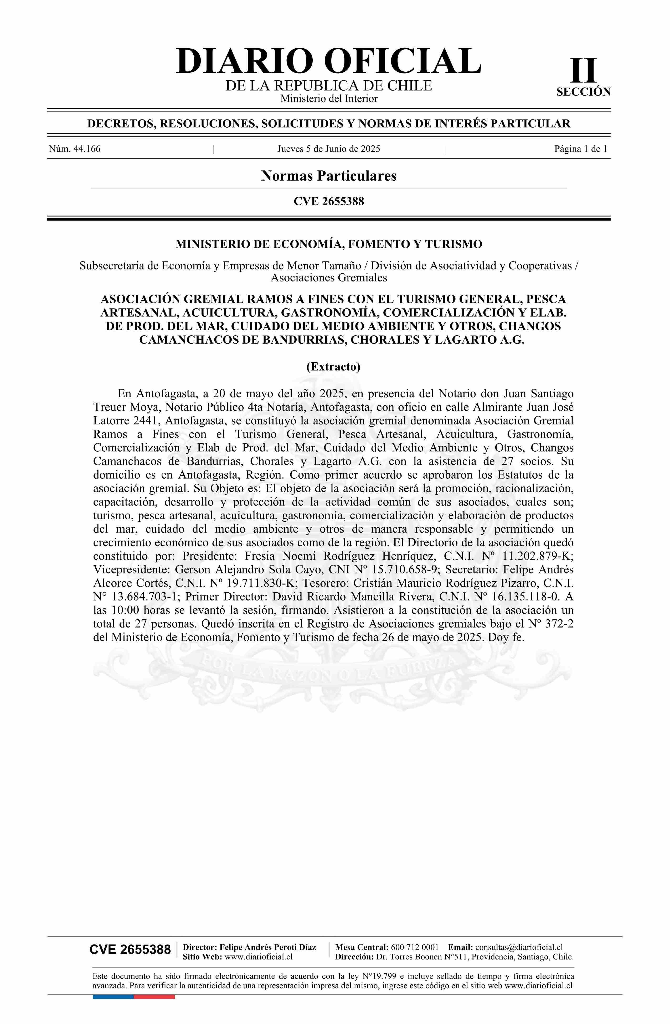 | Título: | Constitución Asociación Gremial Ramos a Fines con el Turismo General, Pesca Artesanal, Acuicultura, Gastronomía, Comercialización y Elab. de Prod. del Mar, Cuidado del Medio Ambiente y Otros, Changos Camanchacos de Bandurrias, Chorales y Lagarto |