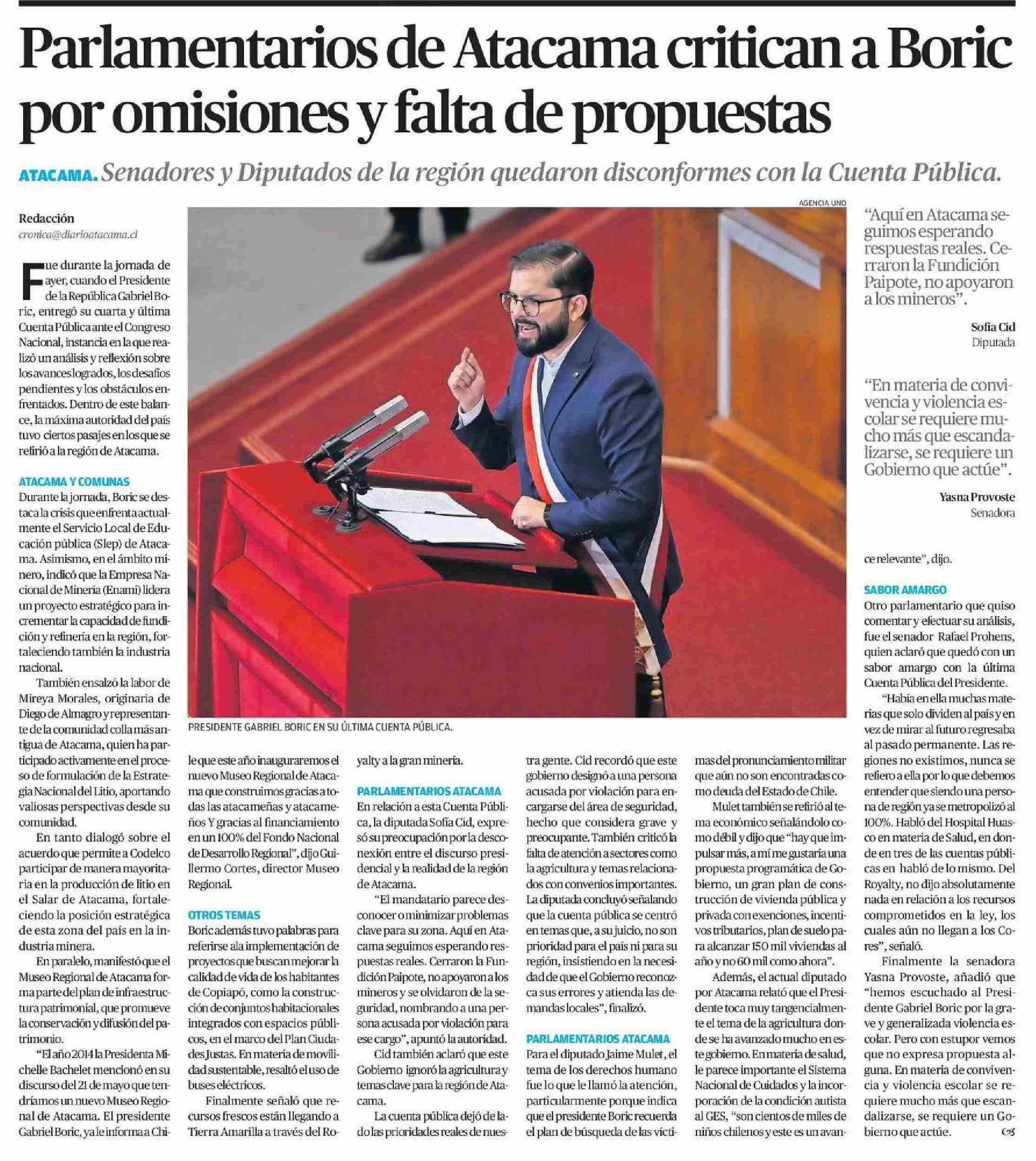Parlamentarios de Atacama critican a Boric por omisiones y falta de propuestas