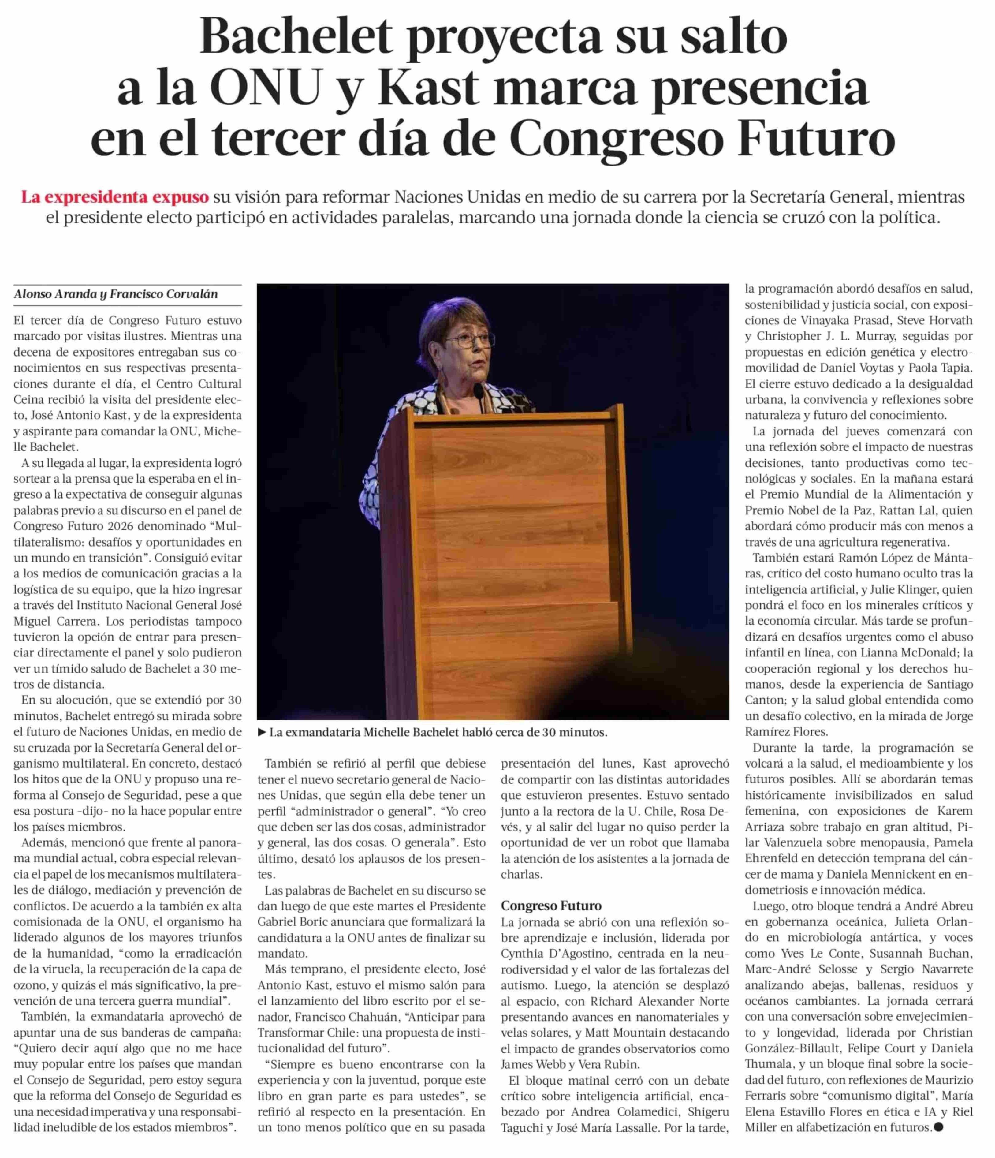 Bachelet proyecta su salto a la ONU y Kast marca presencia en el tercer día de Congreso Futuro
