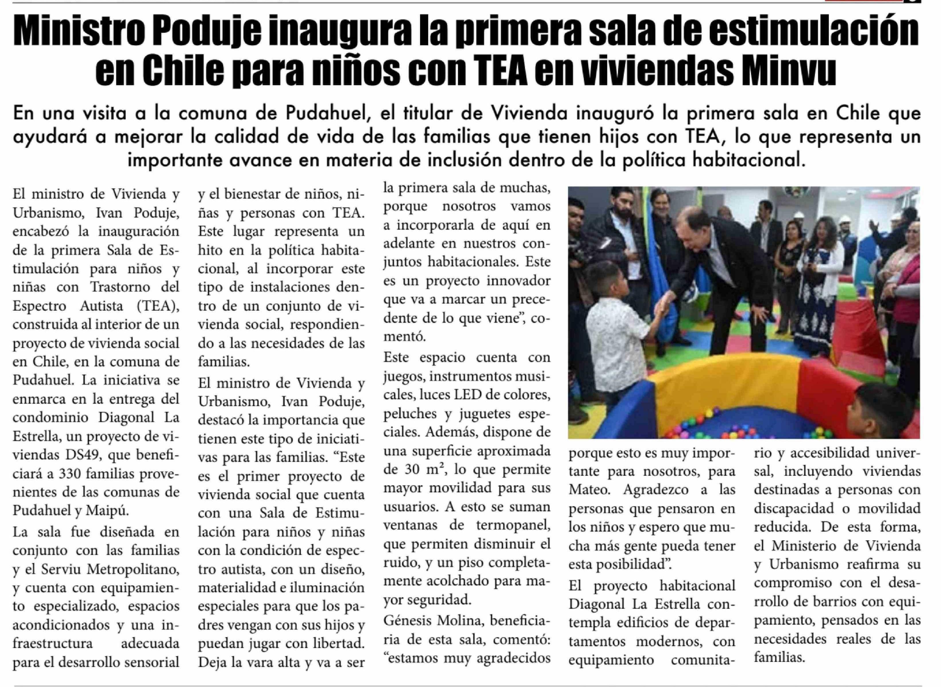 Ministro Poduje inaugura la primera sala de estimulación en Chile para niños con TEA en viviendas Minvu