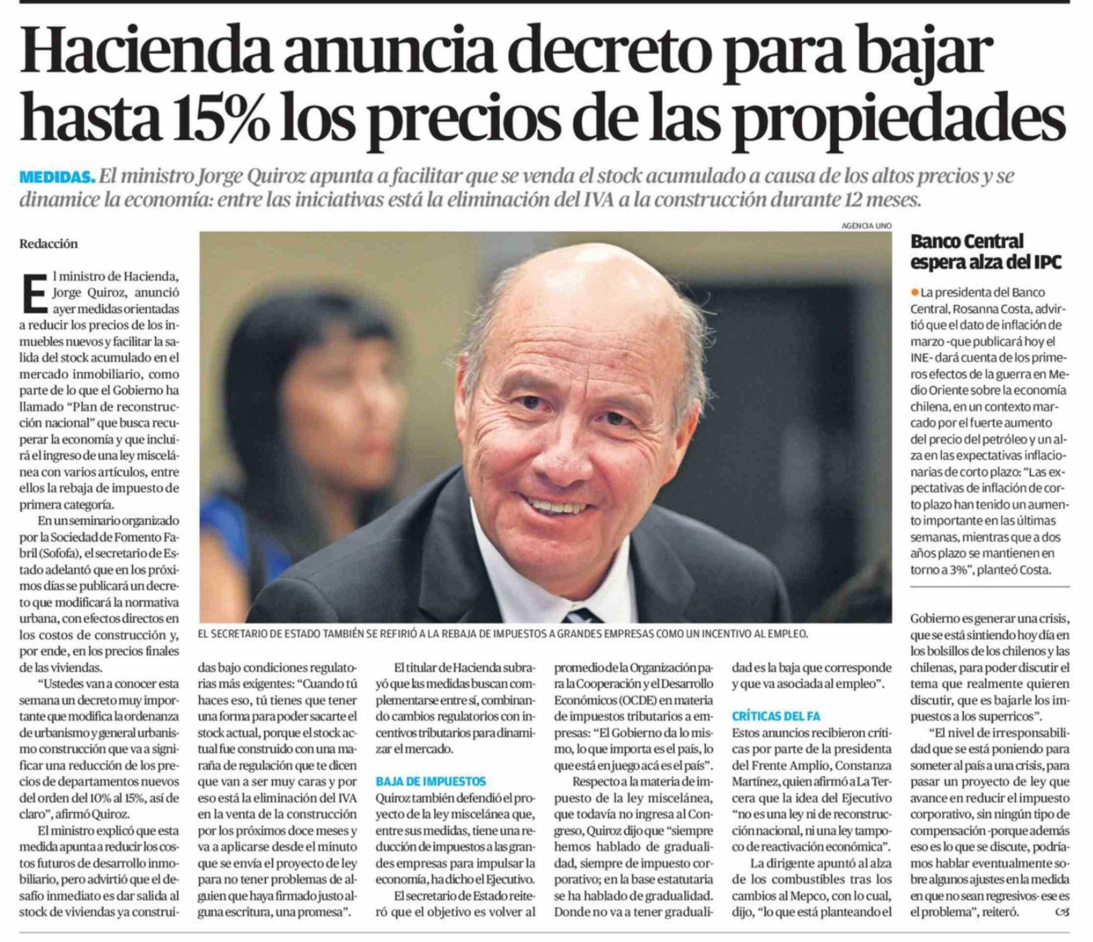 Hacienda anuncia decreto para bajar hasta 15% los precios de las propiedades