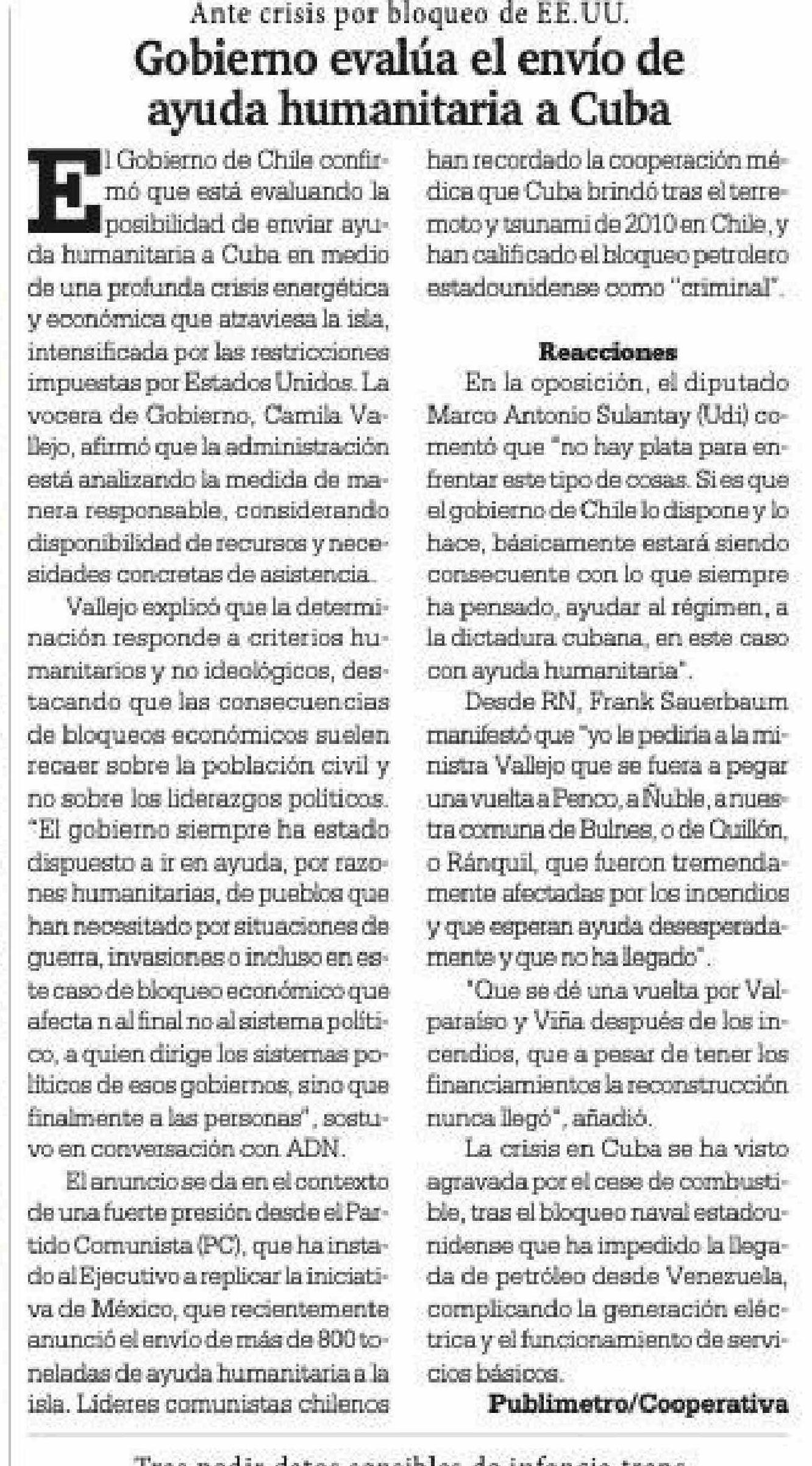 | Título: | Ayuda humanitaria a Cuba I Gobierno de Chile confirhan recordado la cooperación mé mó que está evaluando la dica que Cuba brindó tras el terre |