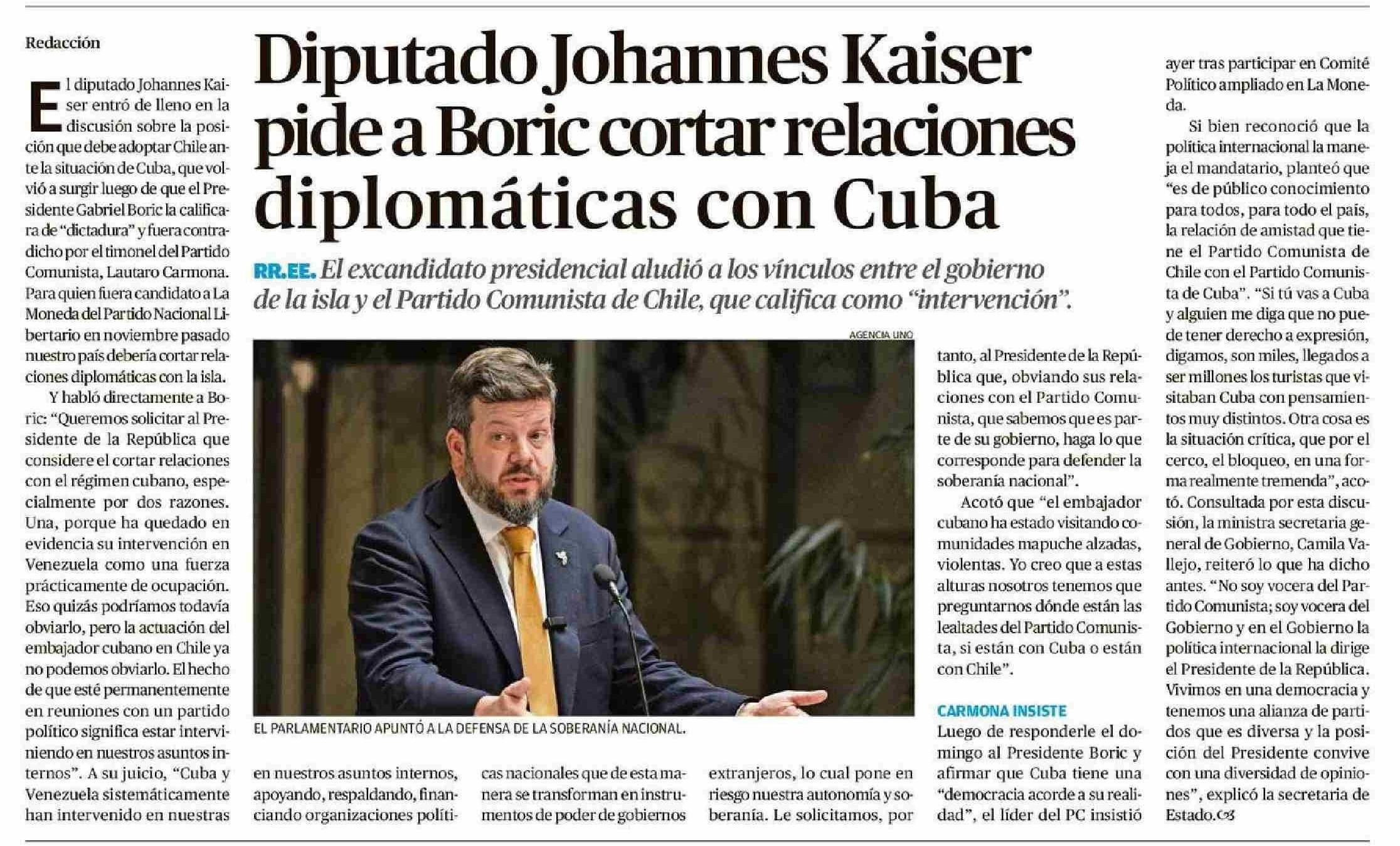 Diputado Johannes Kaiser pide a Boric cortar relaciones diplomáticas con Cuba