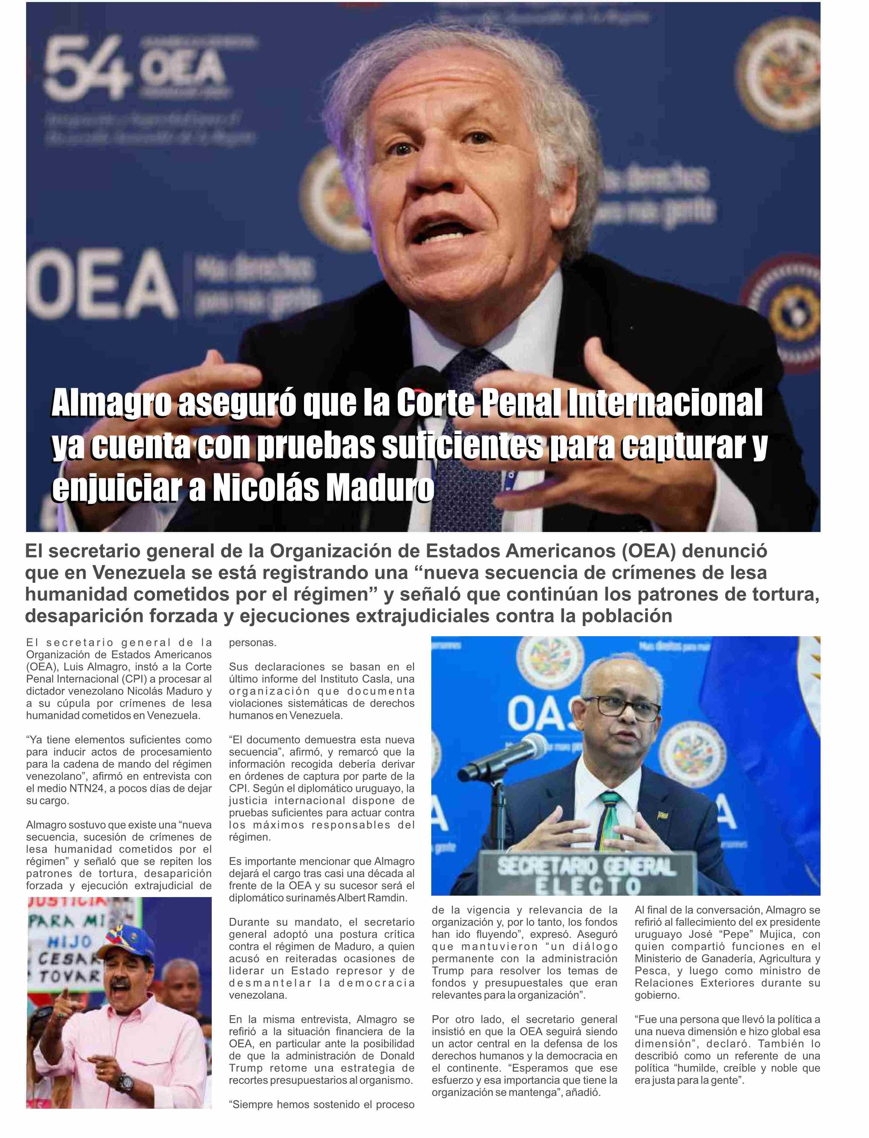 Almagfo. aseguró que la Cor te Penal Internacional ya cuenta con pruebas suficientes para capturar y enjuiciar a Nicolás Maduro