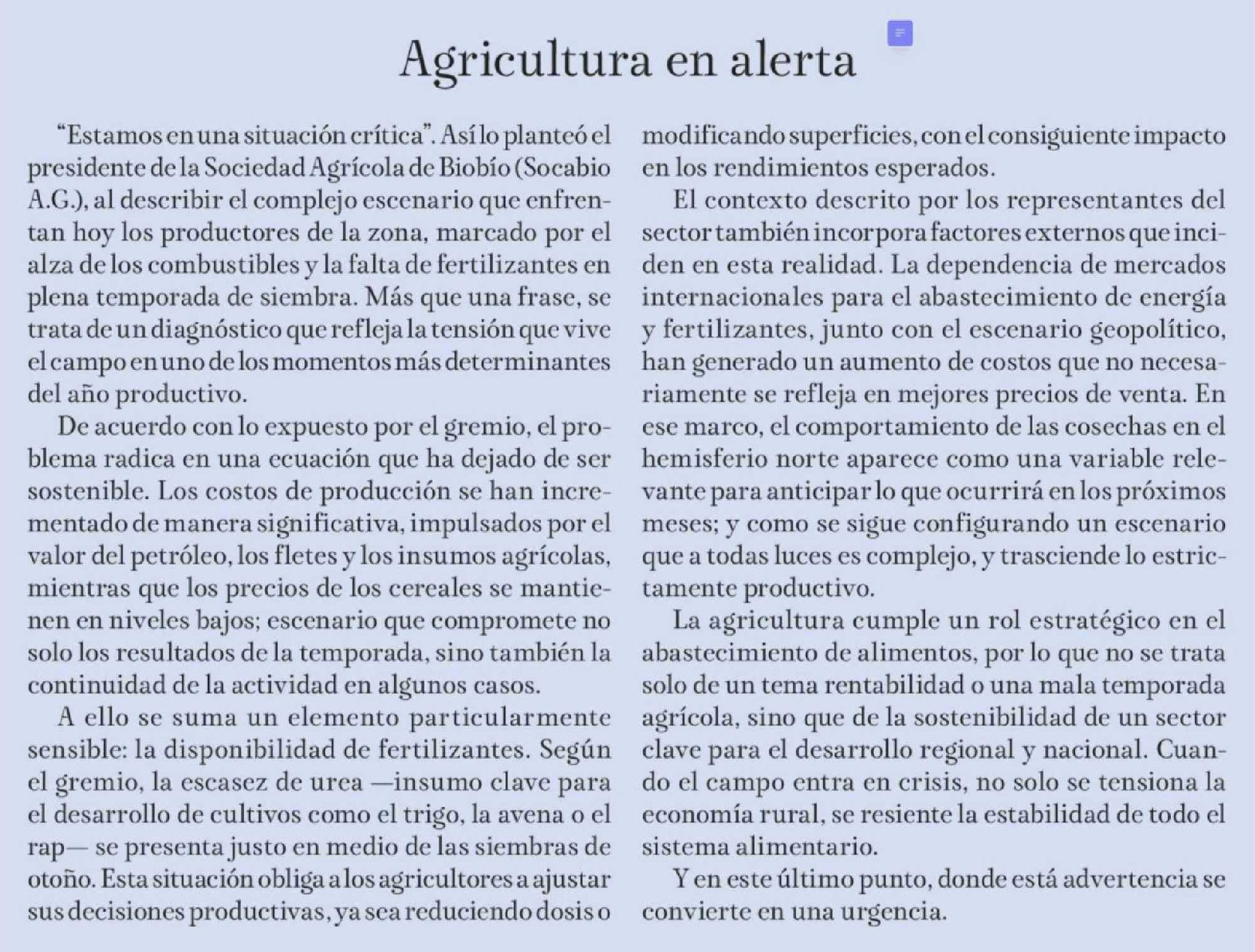 Editorial: Agricultura en alerta