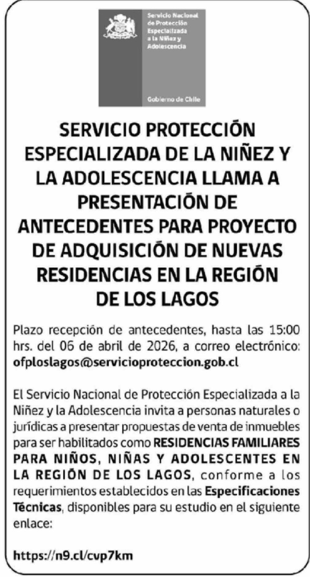 Aviso Licitaciones: SERVICIO PROTECCIÓN ESPECIALIZADA DE LA NIÑEZ Y LA ADOLESCENCIA