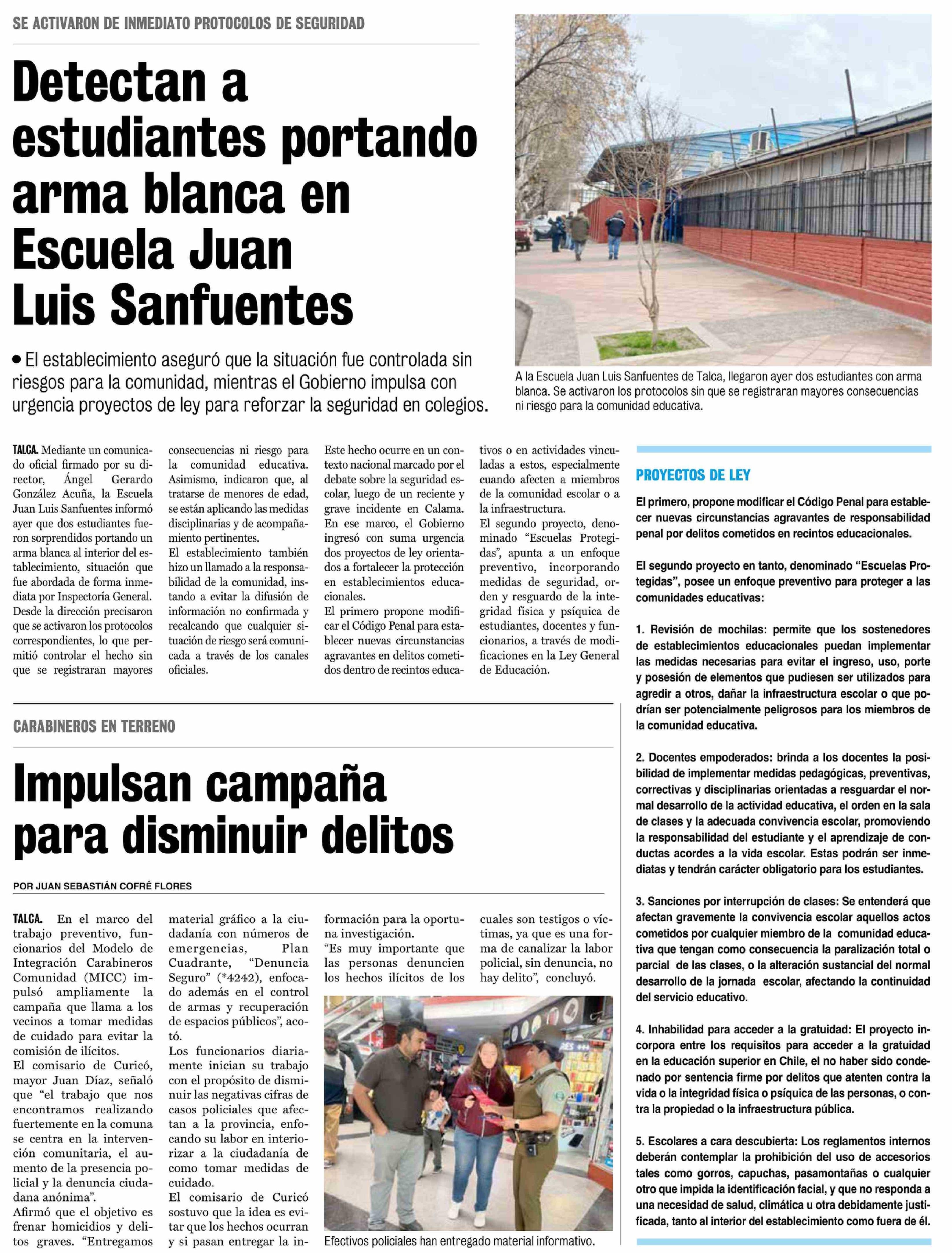 Detectan a estudiantes portando arma blanca en Escuela Juan Luis Sanfuentes