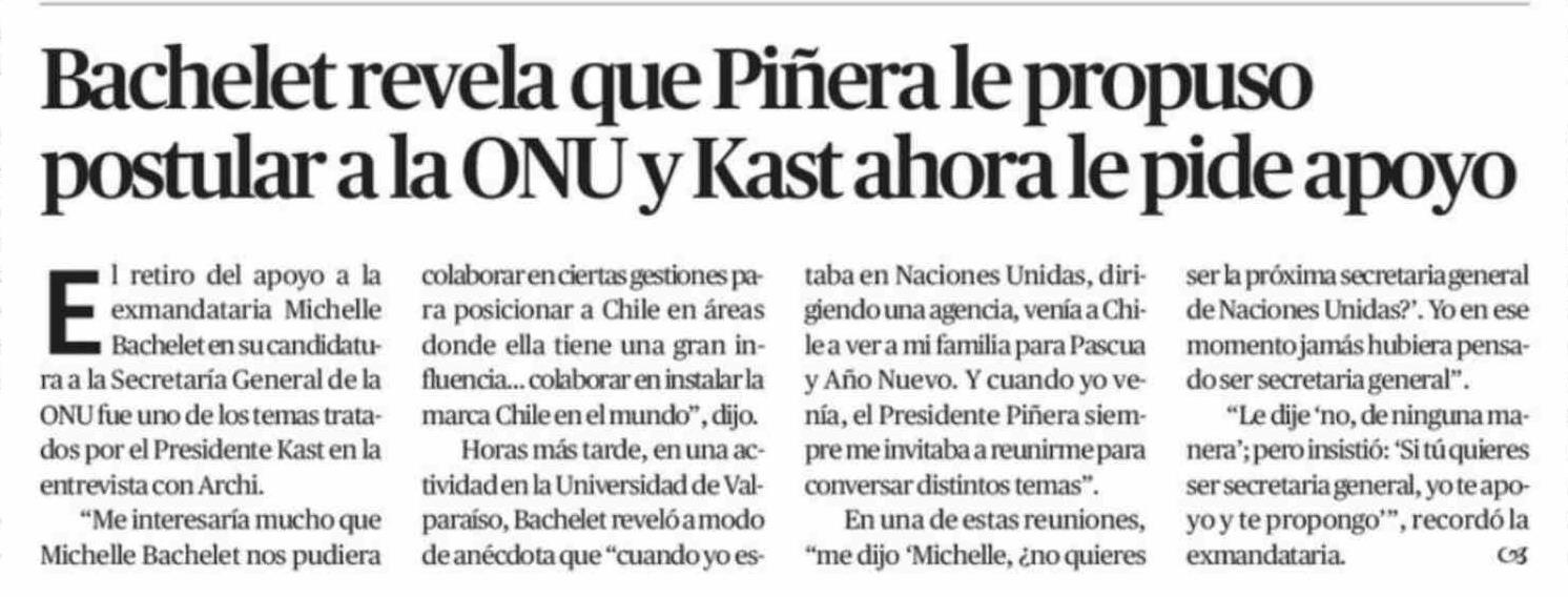 Bachelet revela que Piñera le propuso postular a la ONU y Kast ahora le pide apoyo