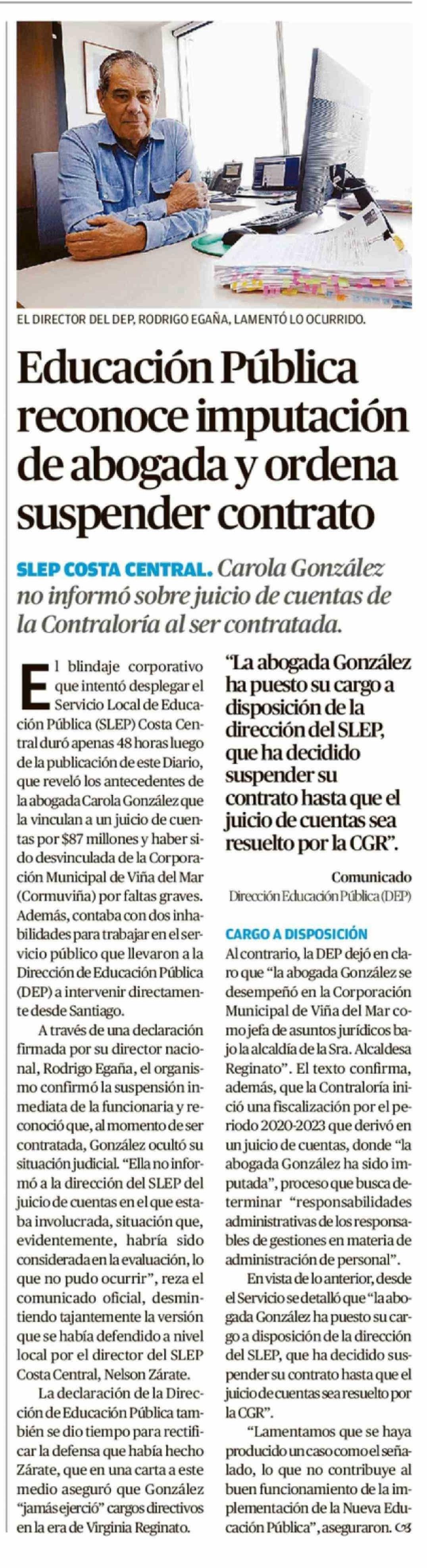 Educación Pública reconoce imputación de abogada y ordena suspender contrato