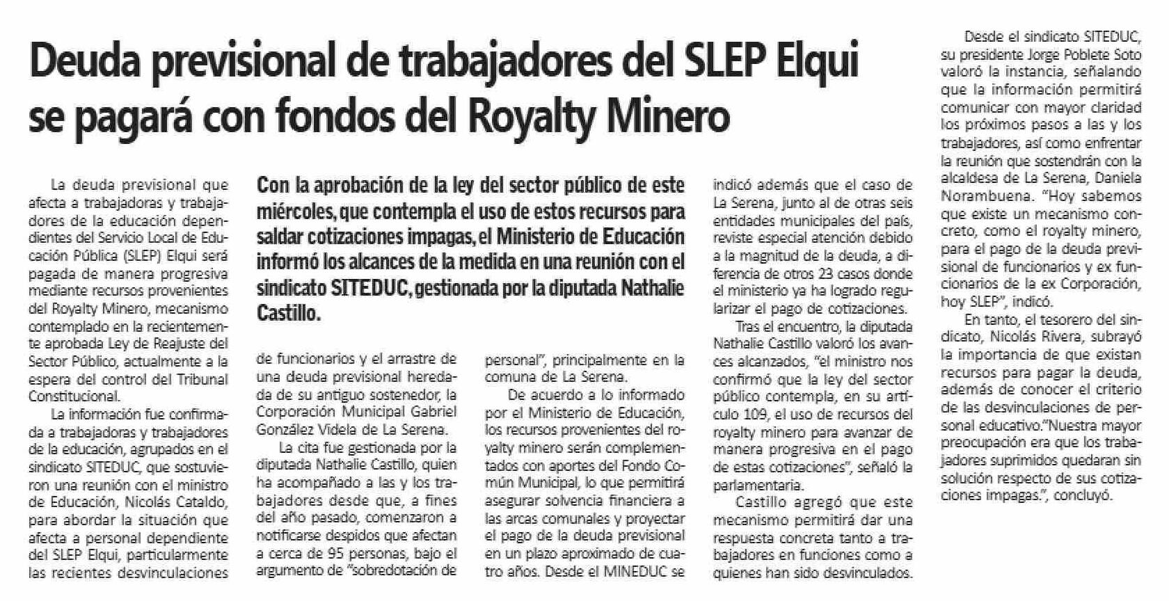Deuda previsional de trabajadores del SLEP Elqui se pagará con fondos del Royalty Minero