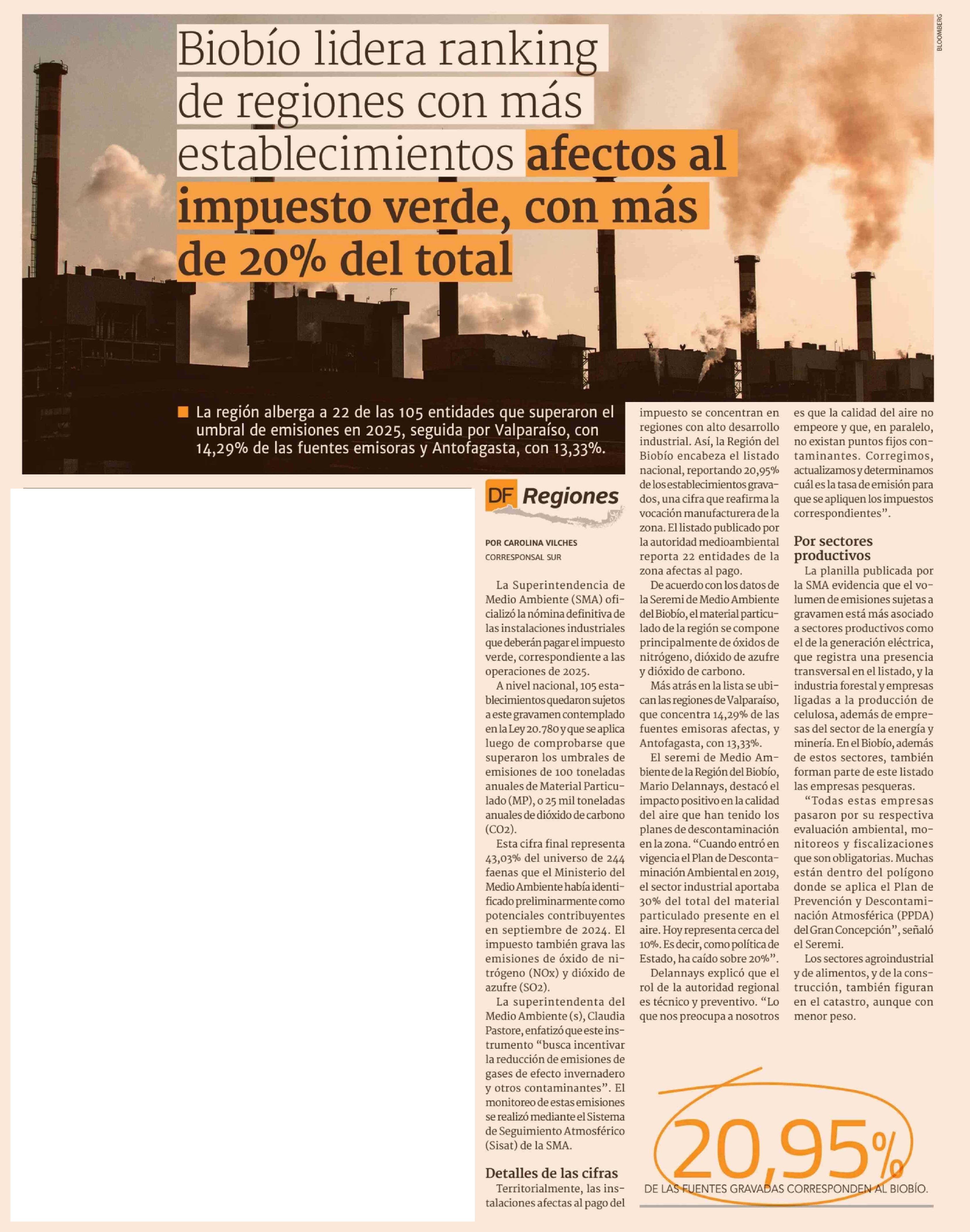 Biobío lidera ranking de regiones con más establecimientos afectos al impuesto verde, con más de 20% del total