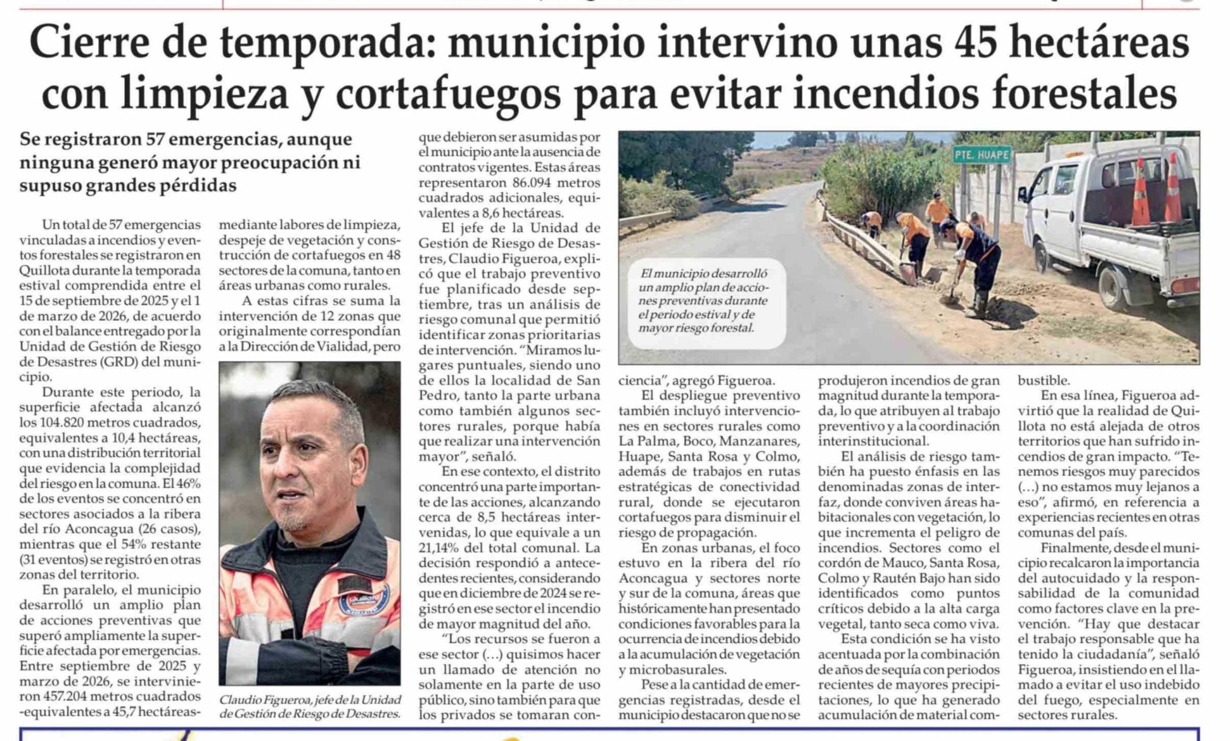 Cierre de temporada: municipio intervino unas 45 hectáreas con limpieza y cortafuegos para evitar incendios forestales