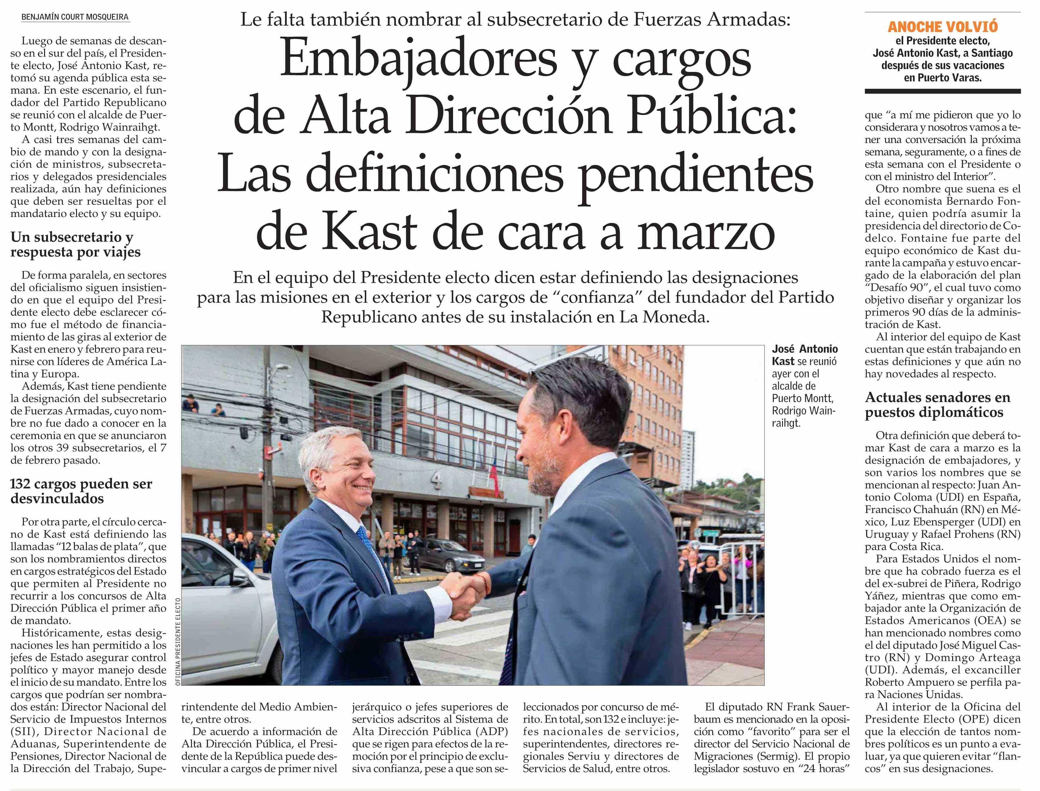 Embajadores y cargos de Alta Dirección Pública: Las definiciones pendientes de Kast de cara a marzo