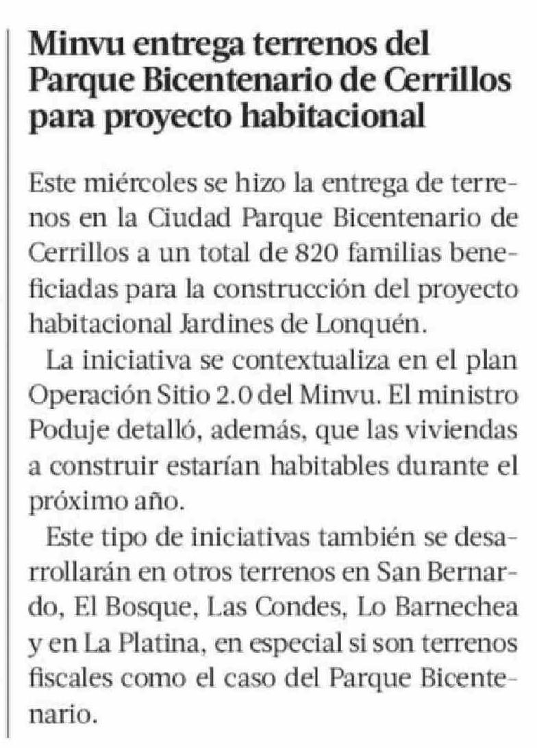 Minvu entrega terrenos del Parque Bicentenario de Cerrillos para proyecto habitacional