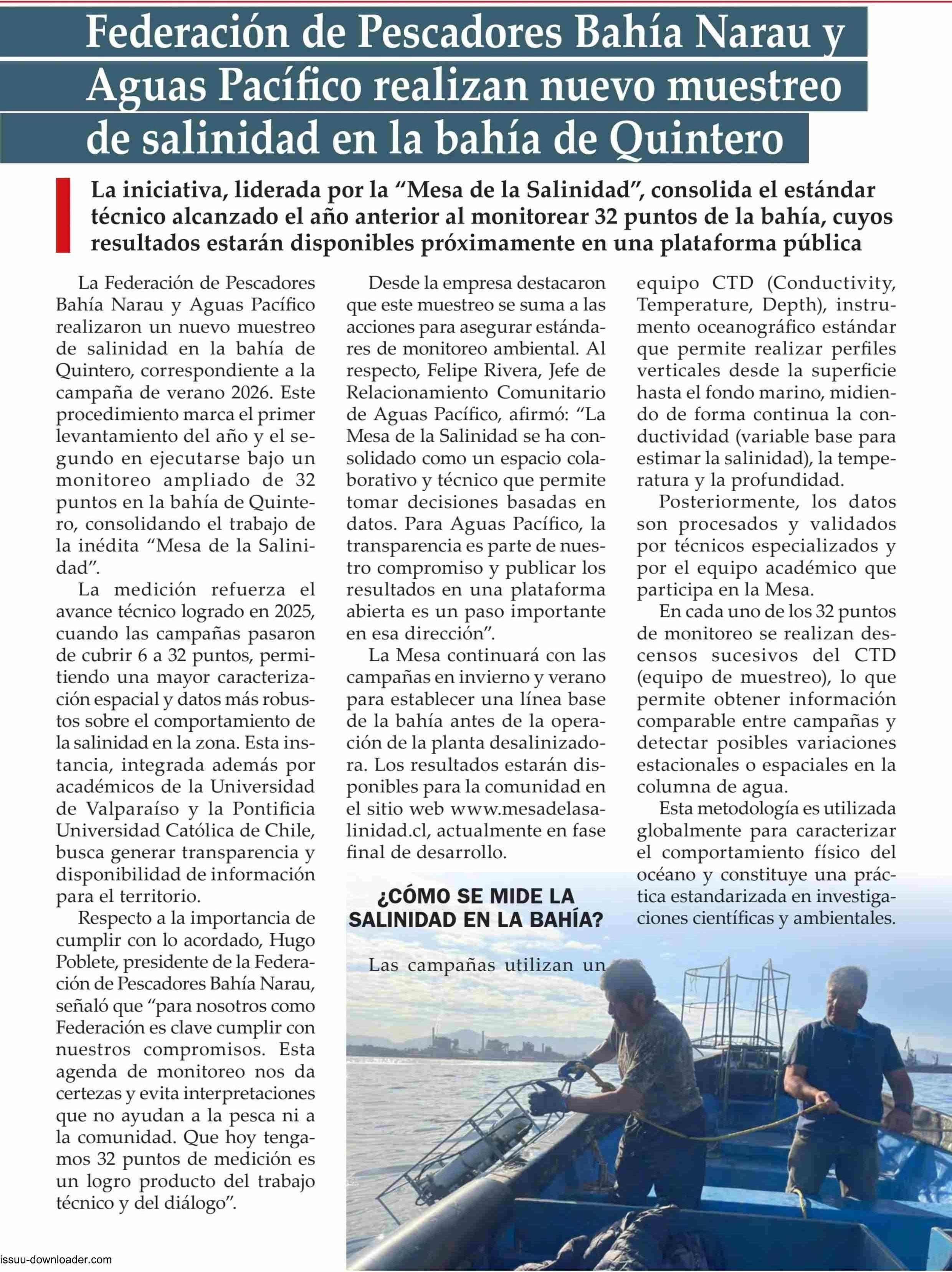 Federación de Pescadores Bahía Narau y Aguas Pacífico realizan nuevo muestreo de salinidad en la bahía de Quintero