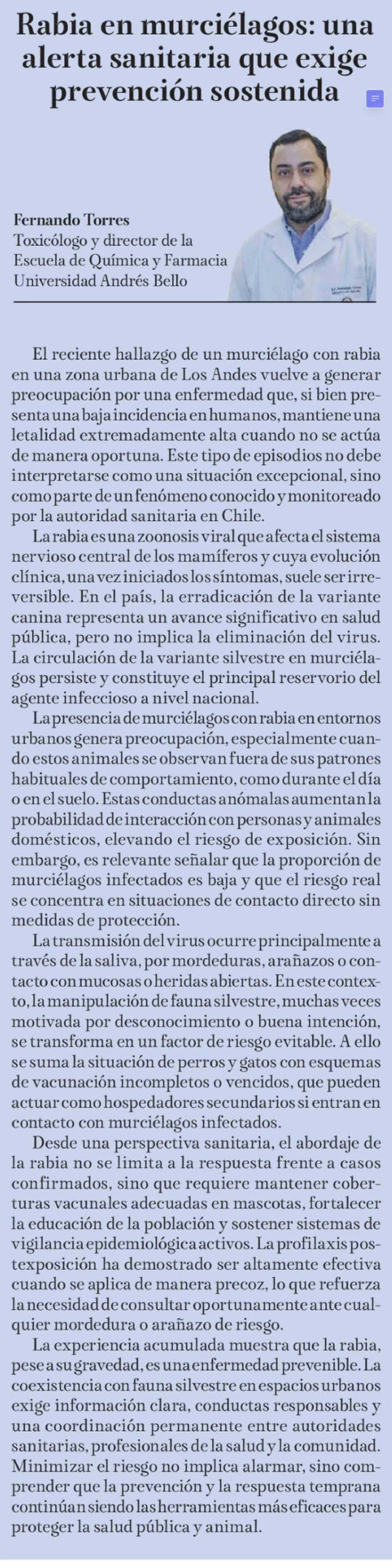 Columnas de Opinión: Rabia en murciélagos: una alerta sanitaria que exige prevención sostenida