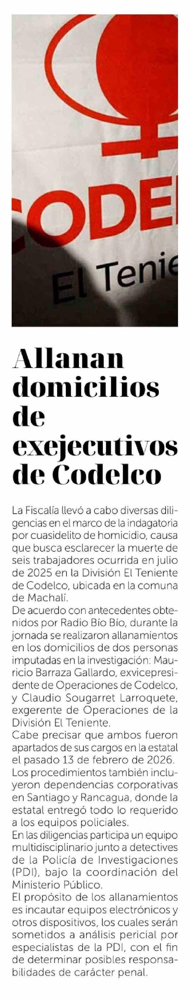 Allanan domicilios de exejecutivos de Codelco