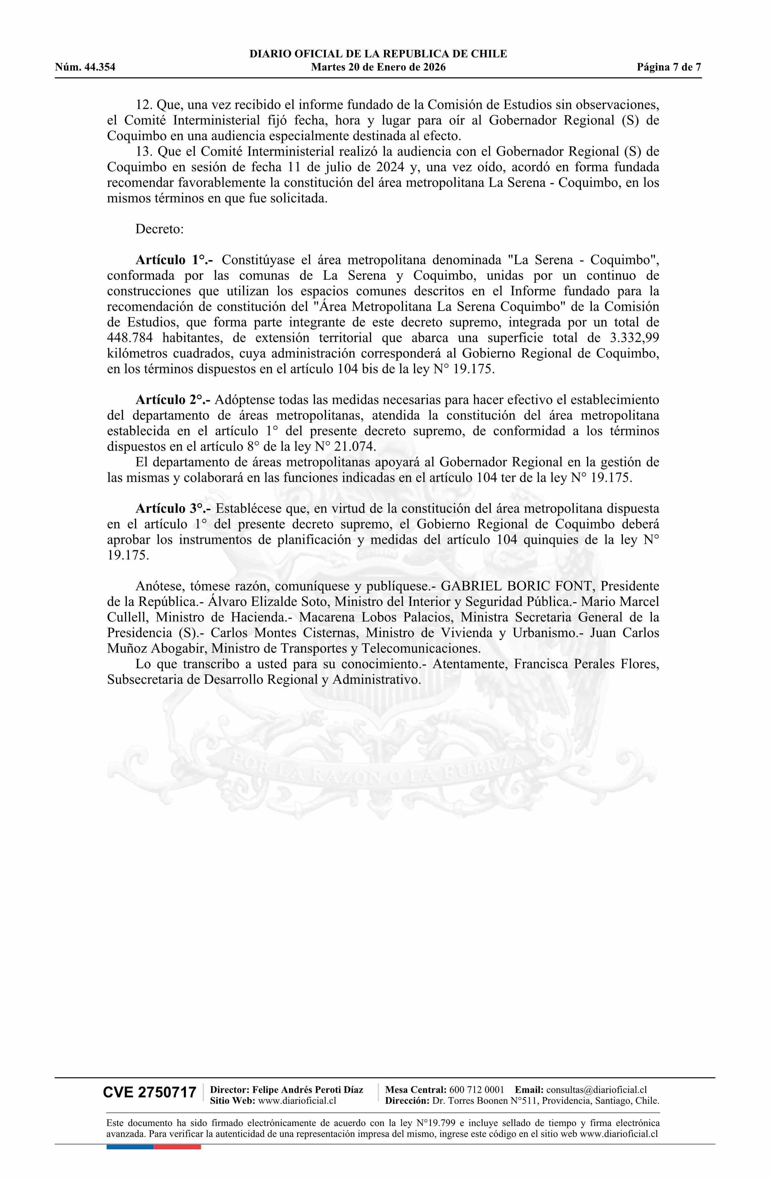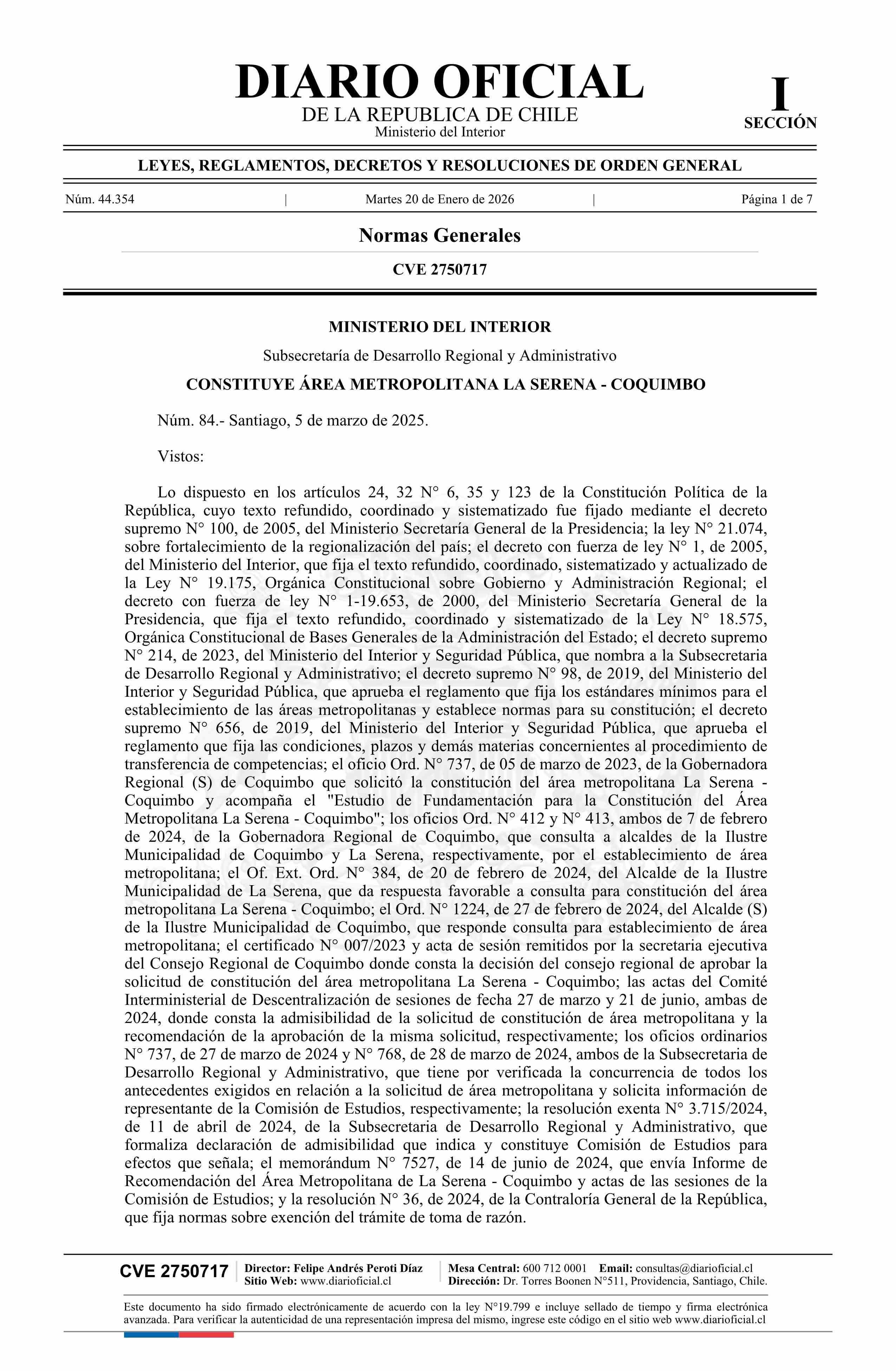 | Título: | Decreto número 84, de 2025.- Constituye Área Metropolitana La Serena - Coquimbo |