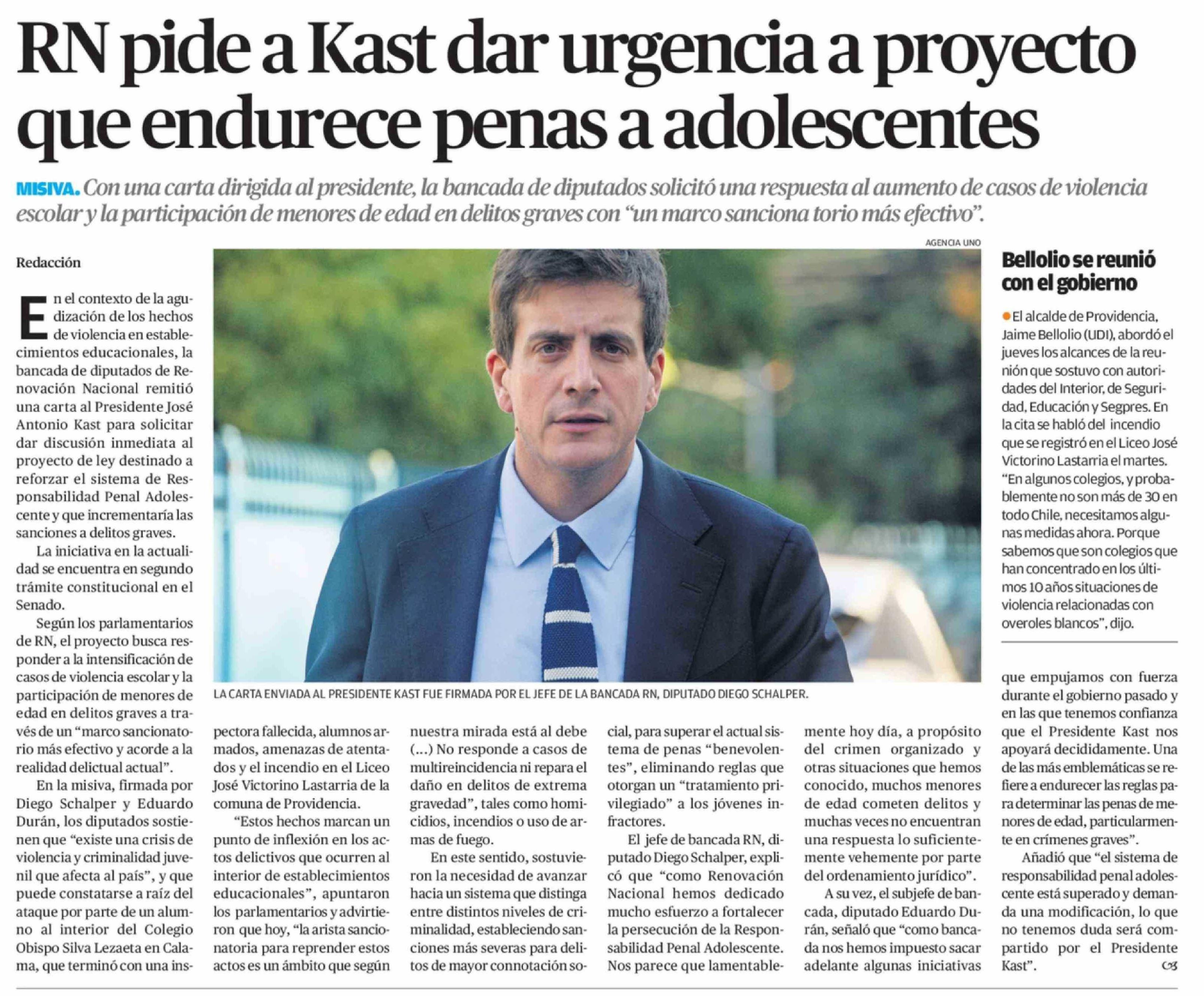 RN pide a Kast dar urgencia a proyecto que endurece penas a adolescentes