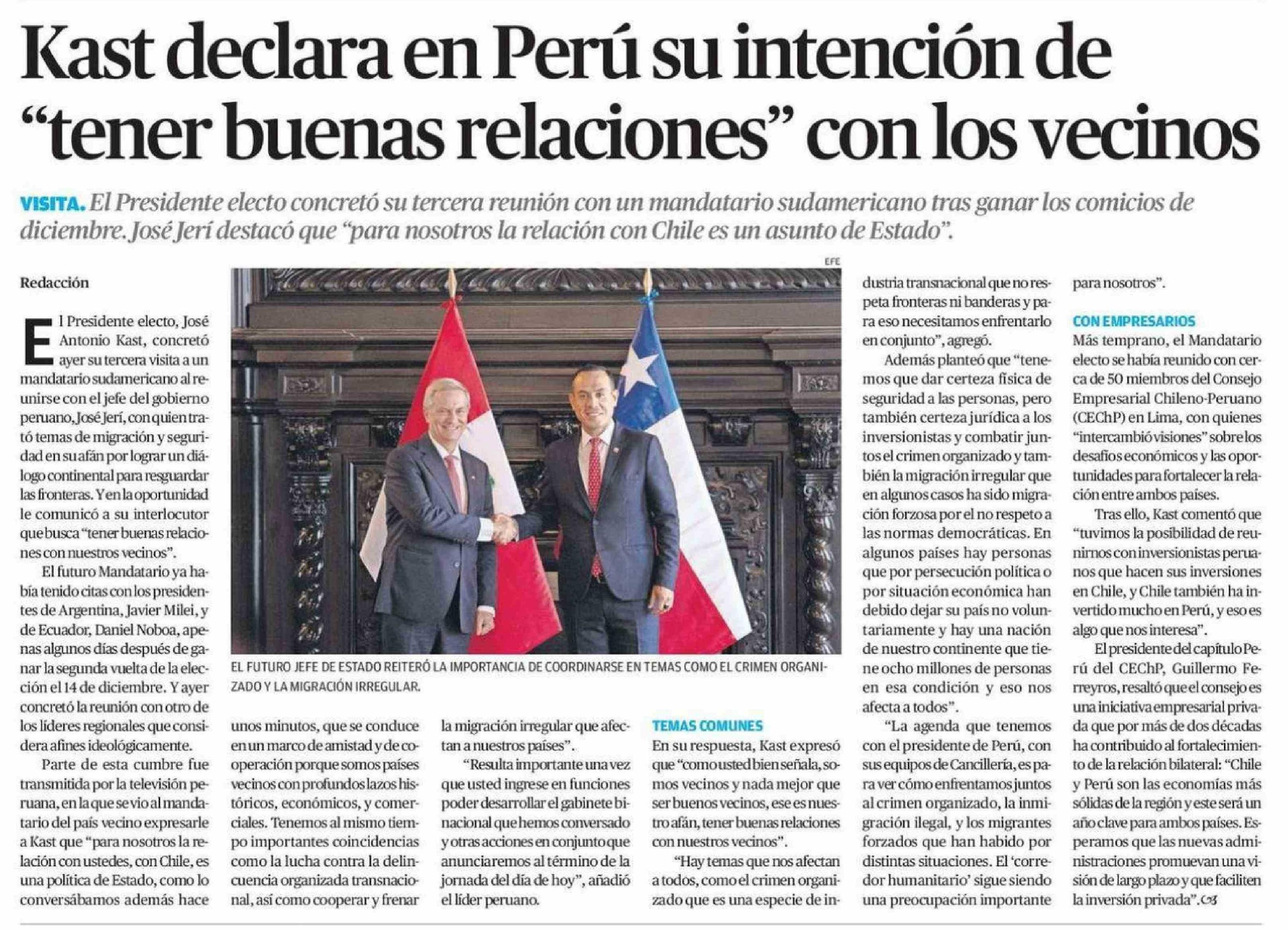 Kast declara en Perú su intención de "tener buenas relaciones" con los vecinos