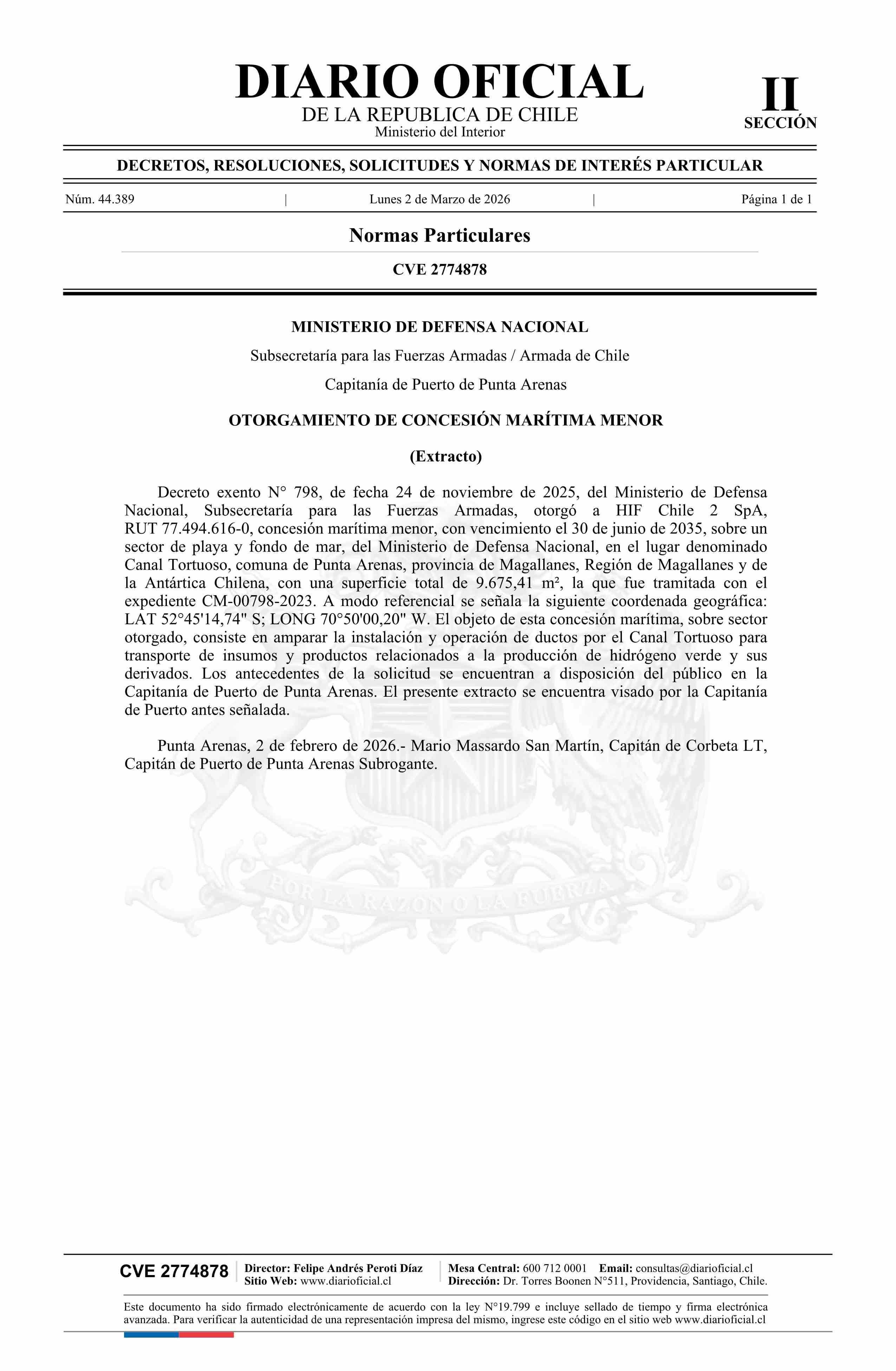 | Título: | Extracto de decreto exento número 798, de 2025.- Otorgamiento de concesión marítima menor |