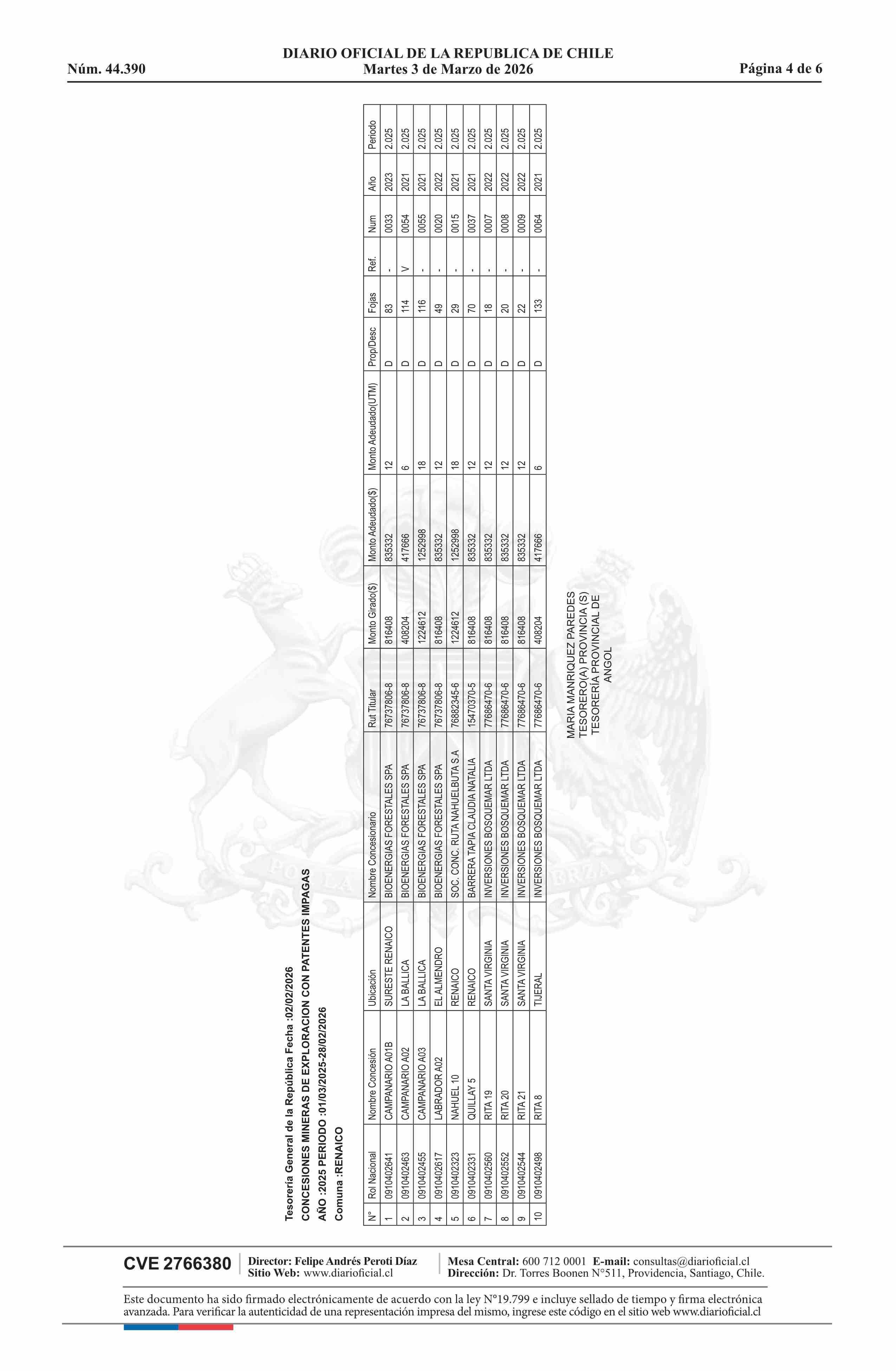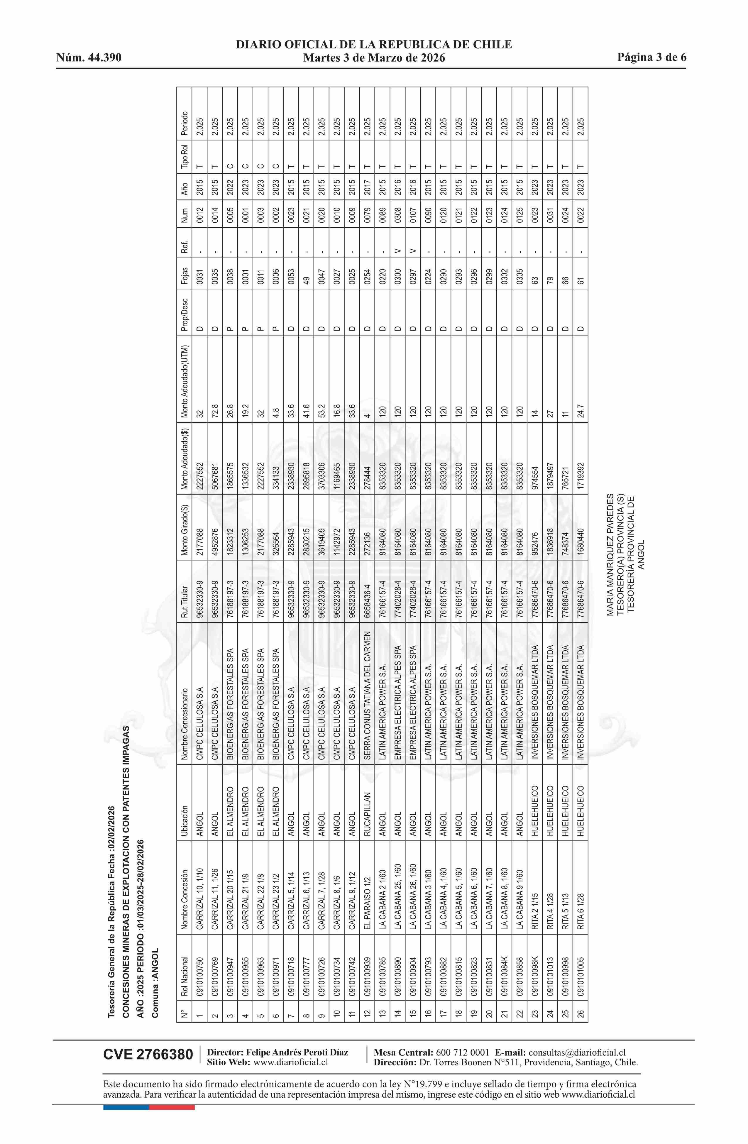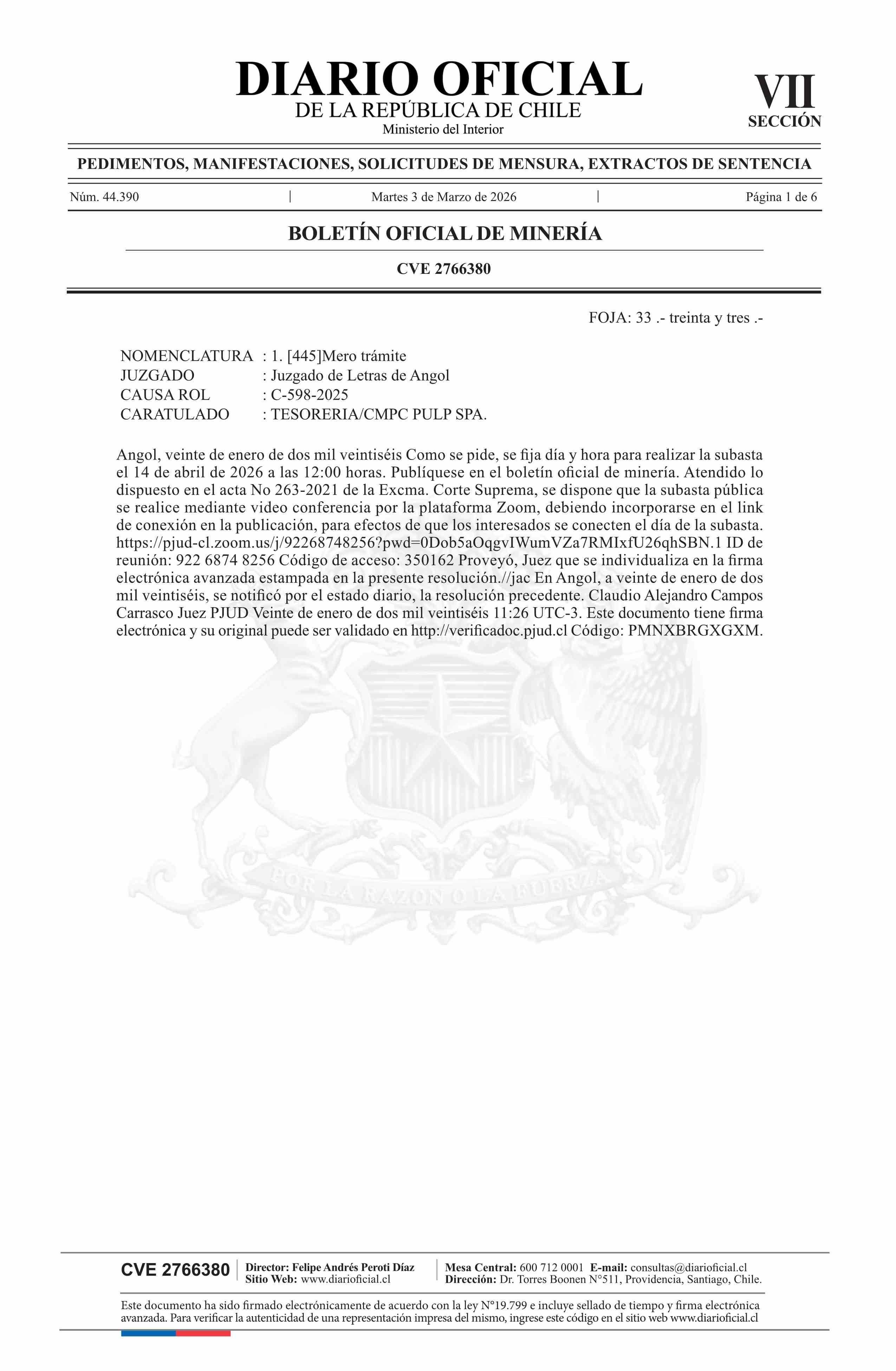 DIARIO OFICIAL CHILE - BOLETÍN OFICIAL DE MINERÍA (DIARIO OFICIAL CHILE – BOM – NÓMINA REMATE)