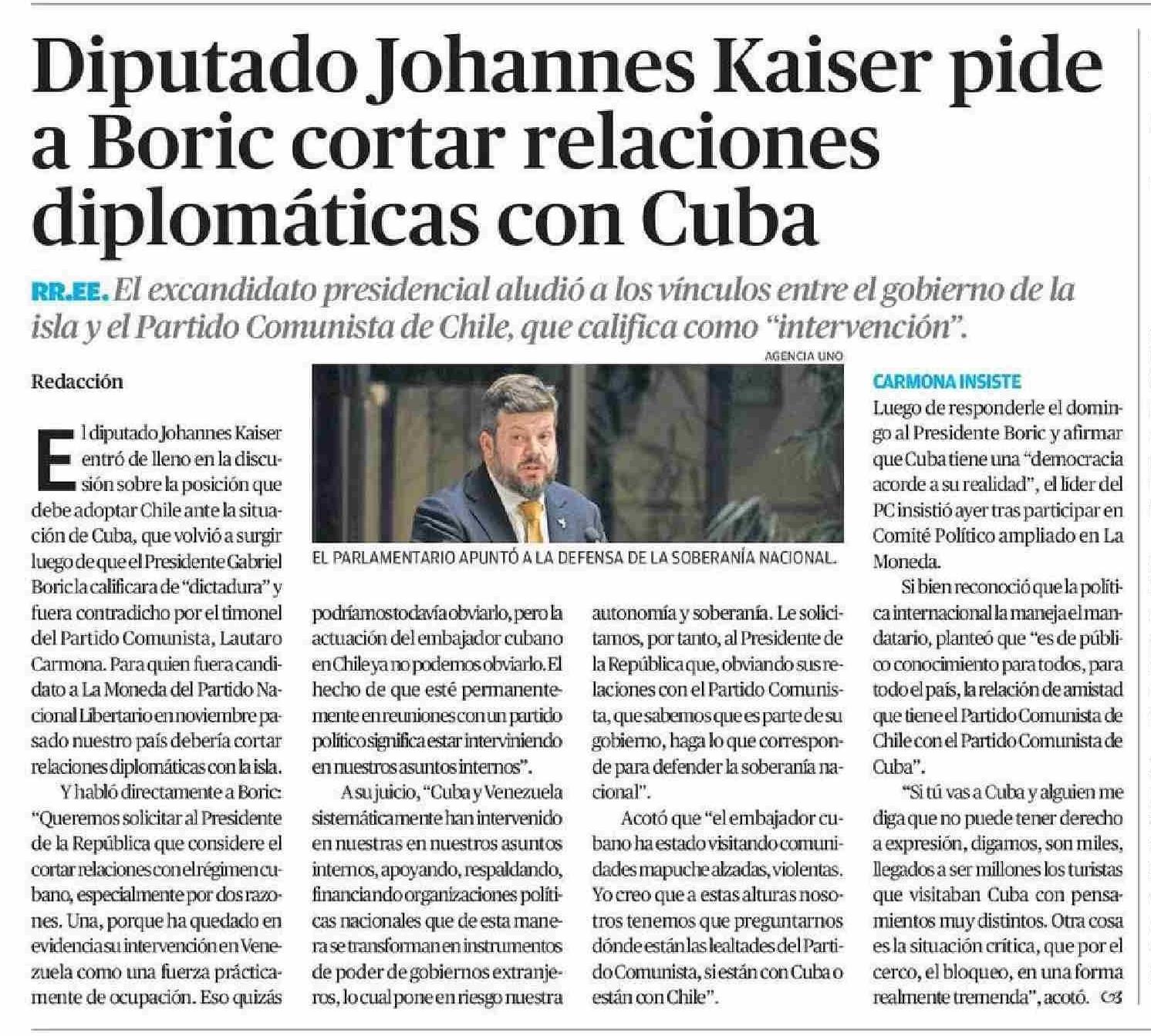Diputado Johannes Kaiser pide a Boric cortar relaciones diplomáticas con Cuba