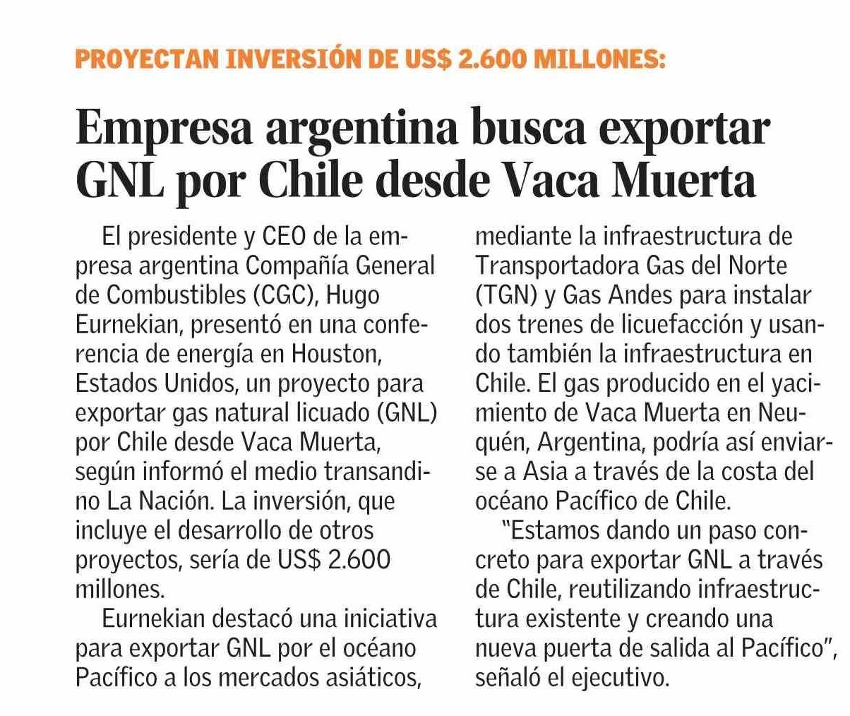 Empresa argentina busca exportar GNL por Chile desde Vaca Muerta
