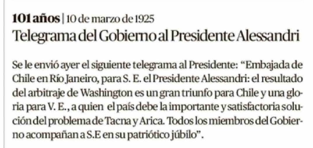 Título: Telegrama del Gobierno al Presidente Alessandri Se le envió ayer el siguiente telegrama al Presidente: "Embajada de Chile en Río Janeiro, para S. E. el Presidente Alessandri: el resultado del arbitraje de Washington es un gran triunfo para Chile y una gloria para V. E., a quien el país debe la impor