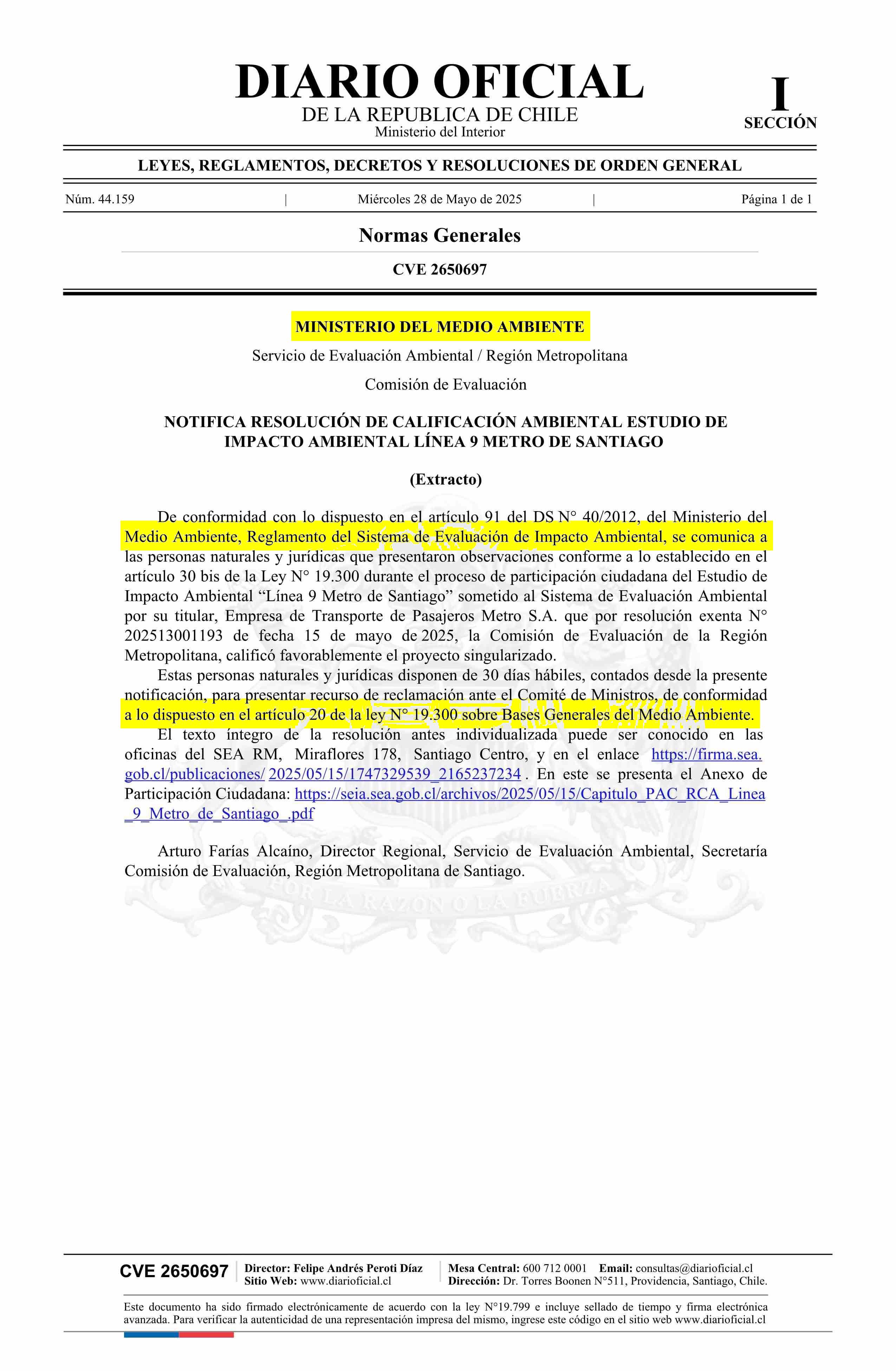 | Título: | Extracto de resolución exenta número 202513001193, de 2025.- Notifica Resolución de Calificación Ambiental de Estudio de Impacto Ambiental Línea 9 Metro de Santiago |