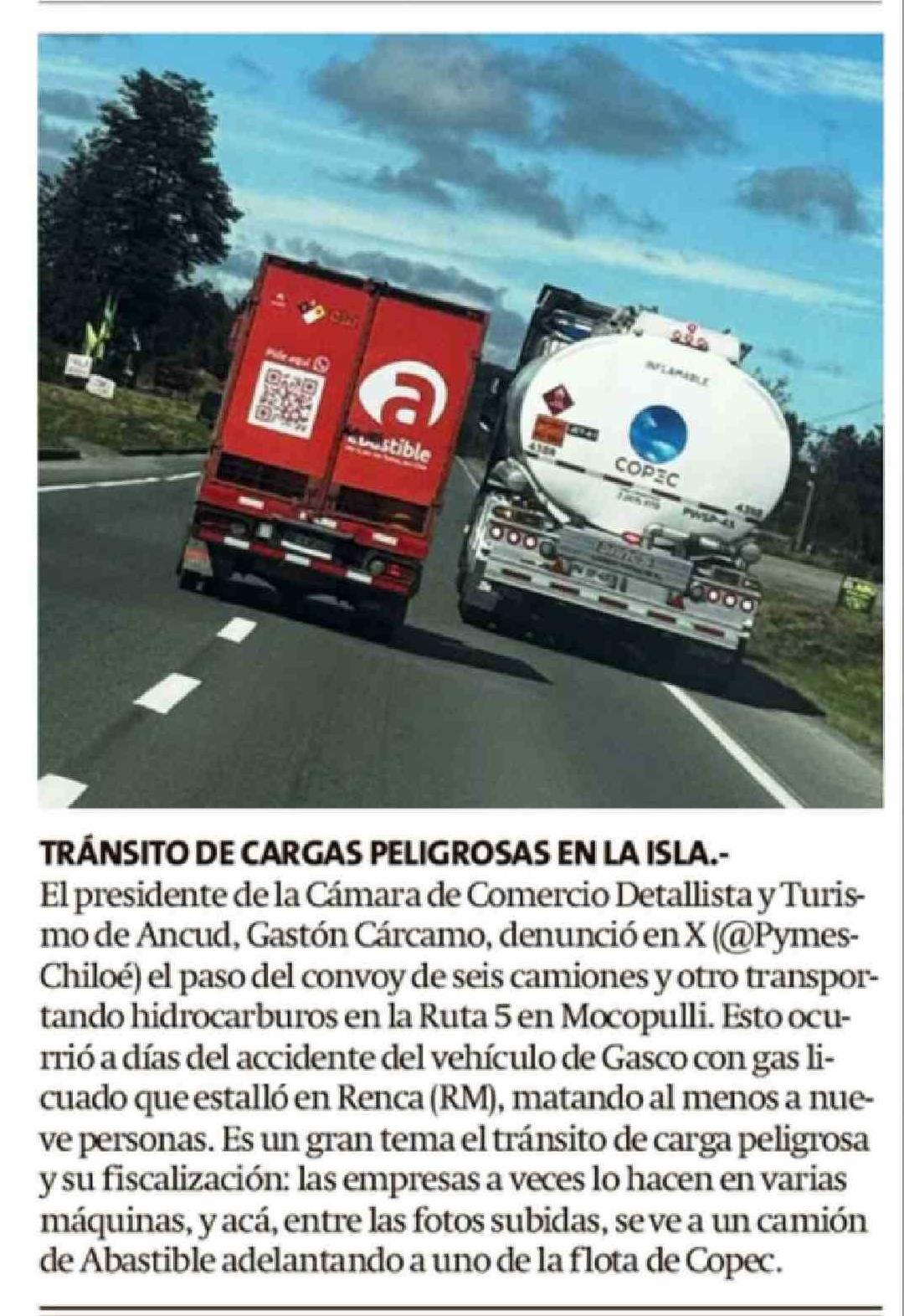 | Título: | TRÁNSITO DE CARGAS PELIGROSAS EN LA ISLA .El presidente de la Cámara de Comercio Detallista y Turismo de Ancud, Gastón Cárcamo, denunció en X (@PymesChiloé) el paso del convoy de seis camiones y otro transportando hidrocarburos en la Ruta 5 en Mocopulli. Esto ocurrió a días del accidente del vehícul |