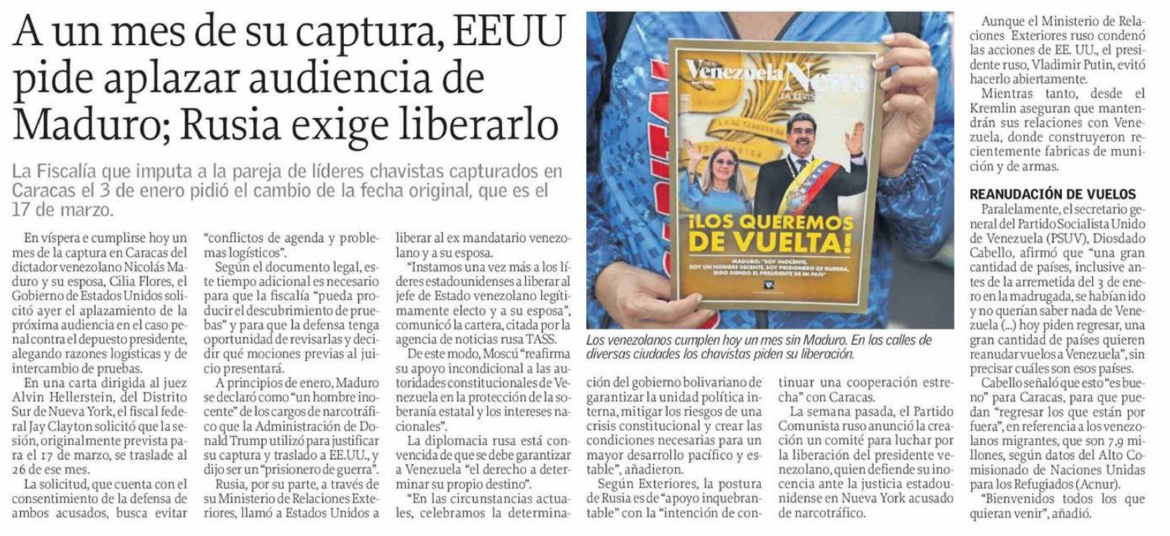 A un mes de su captura, EEUU pide aplazar audiencia de Maduro; Rusia exige liberarlo