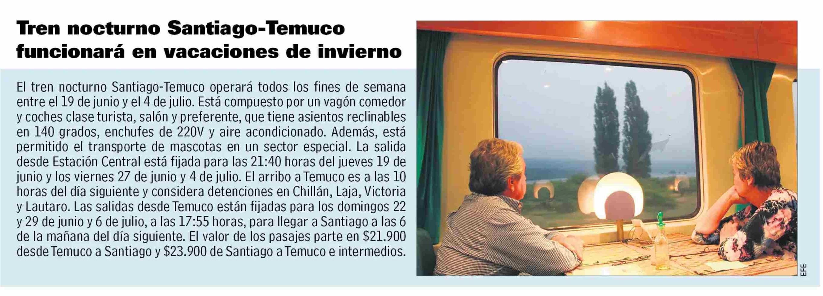 Tren nocturno Santiago-Temuco funcionará en vacaciones de invierno