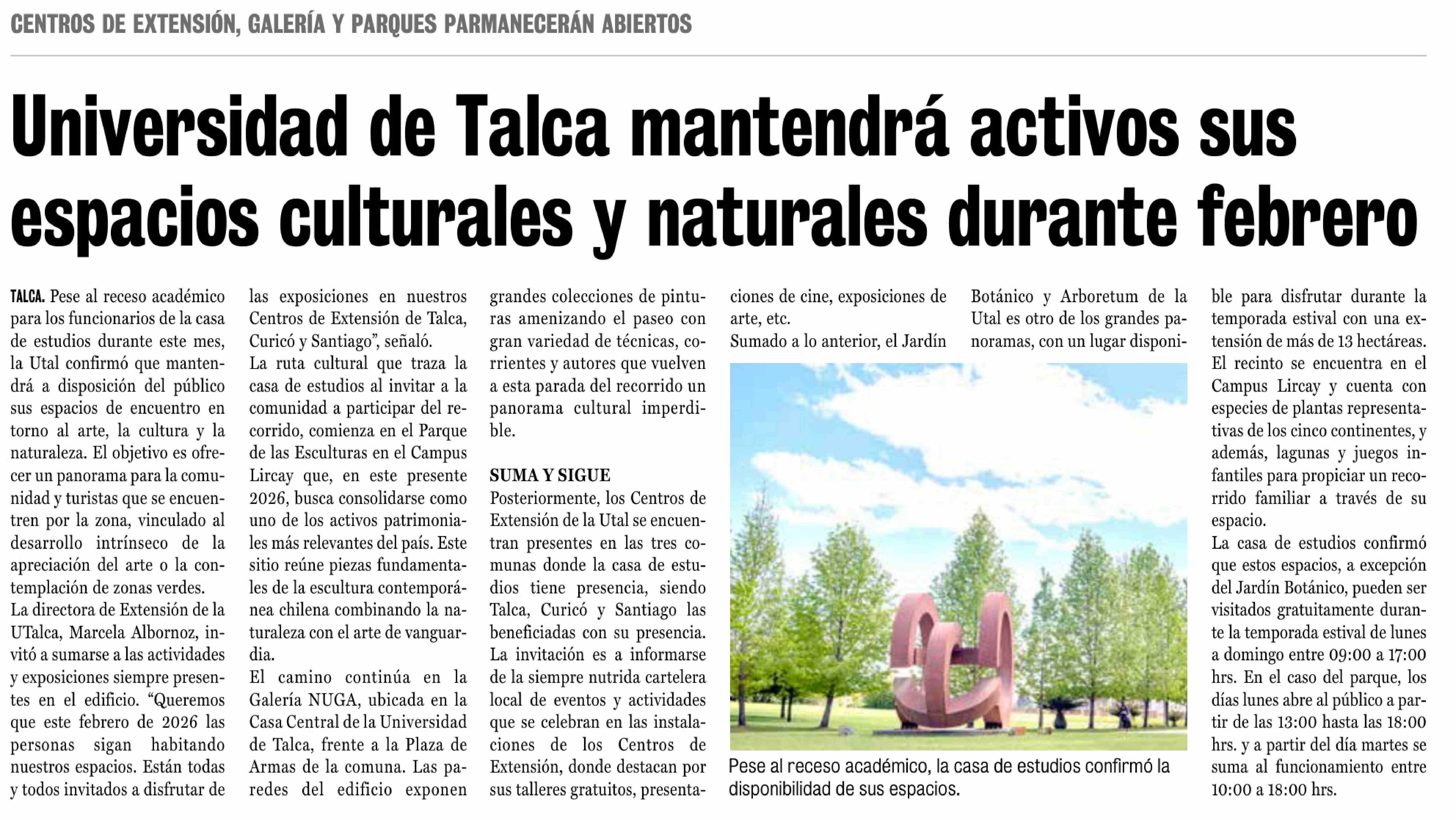 Universidad de Talca mantendrá activos sus espacios culturales y naturales durante febrero