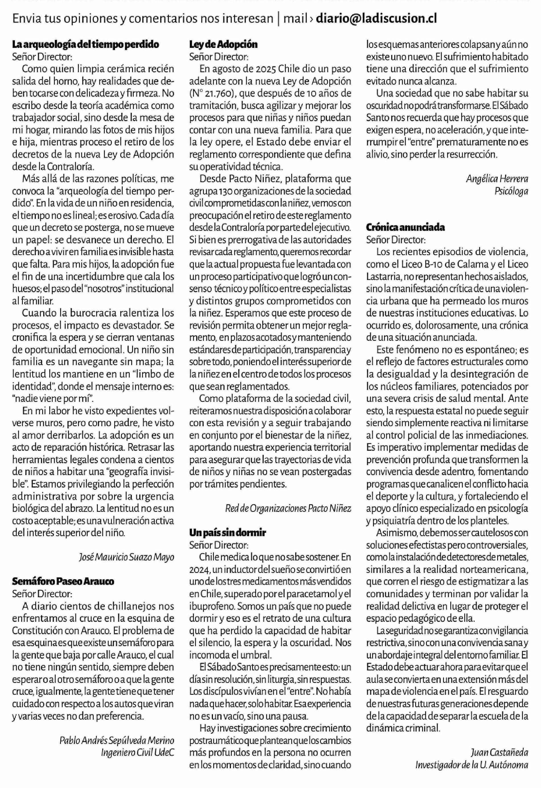 Título: Envia tus opiniones y comentarios nos interesan | mail > diario@ladiscusion.cl los esquemas anteriores colapsany aún no existe uno nuevo. El sufrimiento habitado tiene una dirección que el sufrimiento La arqueología del tiempo perdido Señor Director: Como quien limpia cerámica recién salida del horn