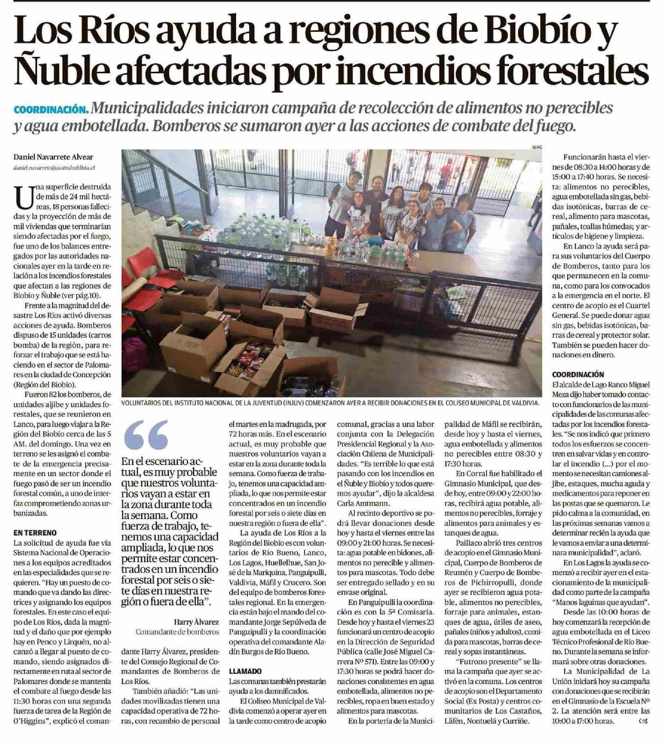 Los Ríos ayuda a regiones de Biobío y Nuble afectadas por incendios forestales