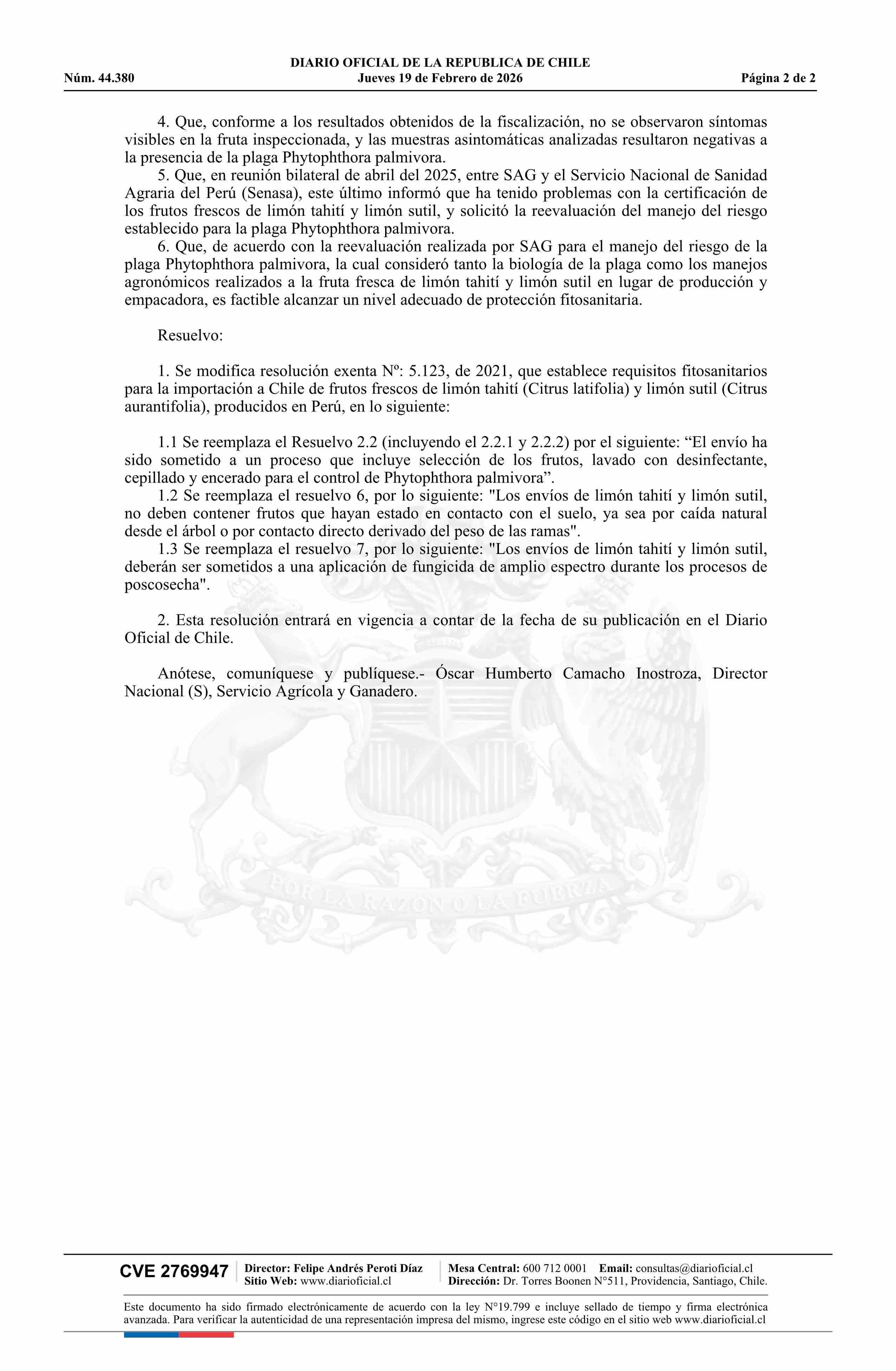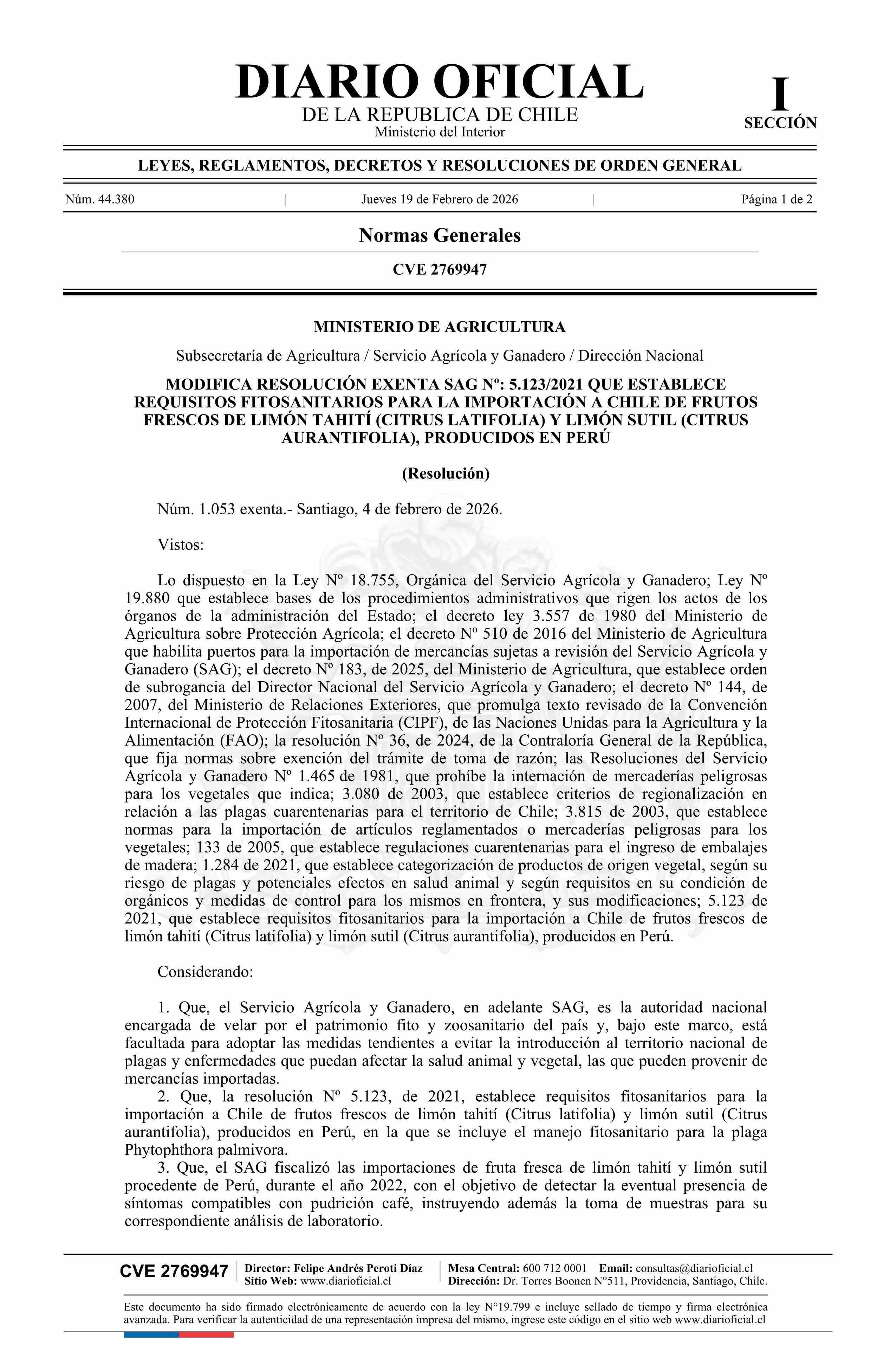 | Título: | Resolución exenta número 1.053, de 2026.- Modifica resolución Nº 5.123 exenta, de 2021, que establece requisitos fitosanitarios para la importación a Chile de frutos frescos de limón Tahití (Citrus latifolia) y limón sutil (Citrus aurantifolia), producidos en Perú |